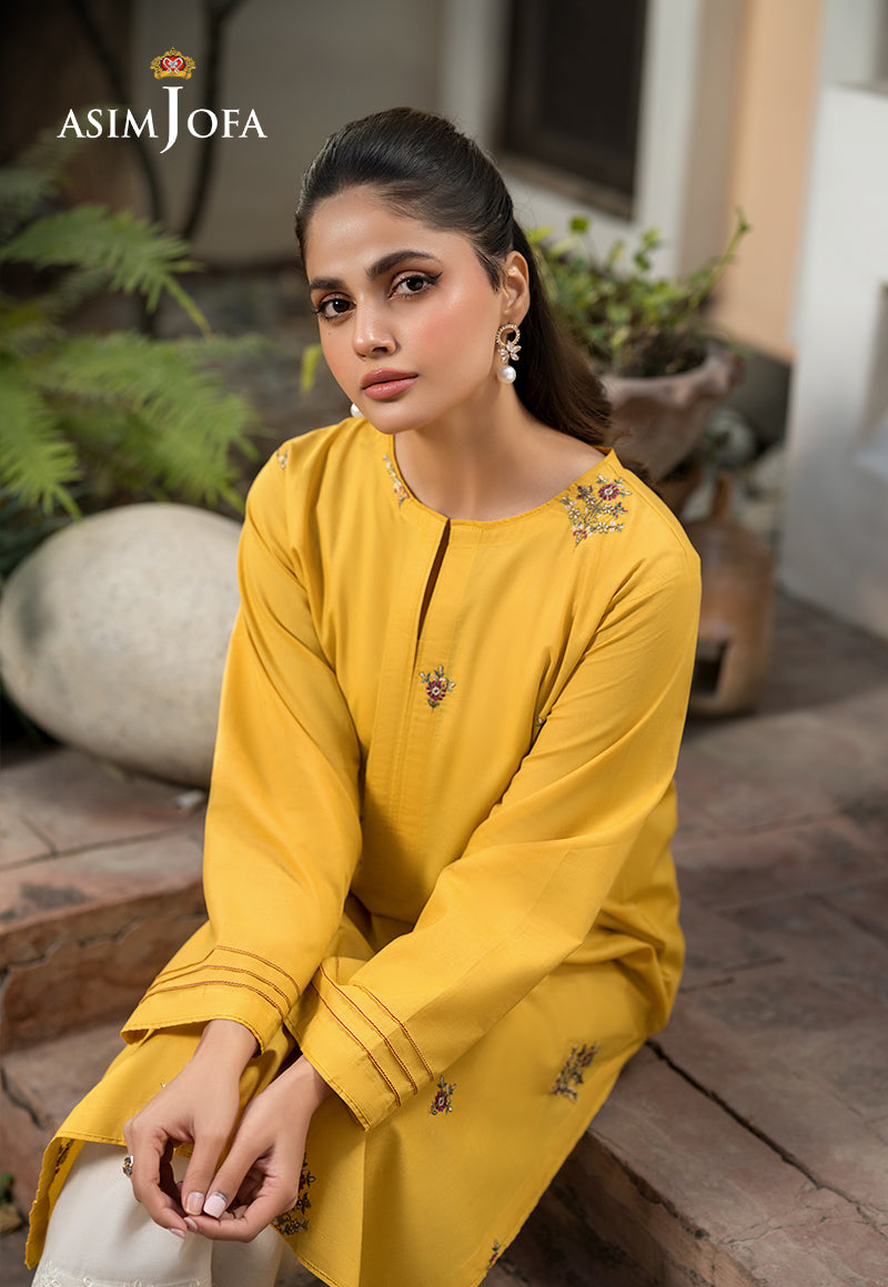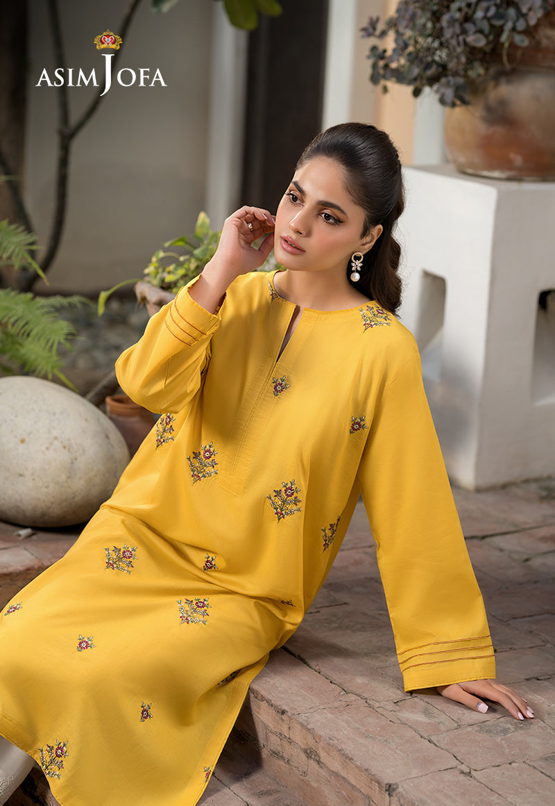 Radiate the vibrant charm of a marigold in this yellow shirt, adorned with exquisite floral embroidery gracefully scattered across the fabric, exuding warmth and timeless elegance.