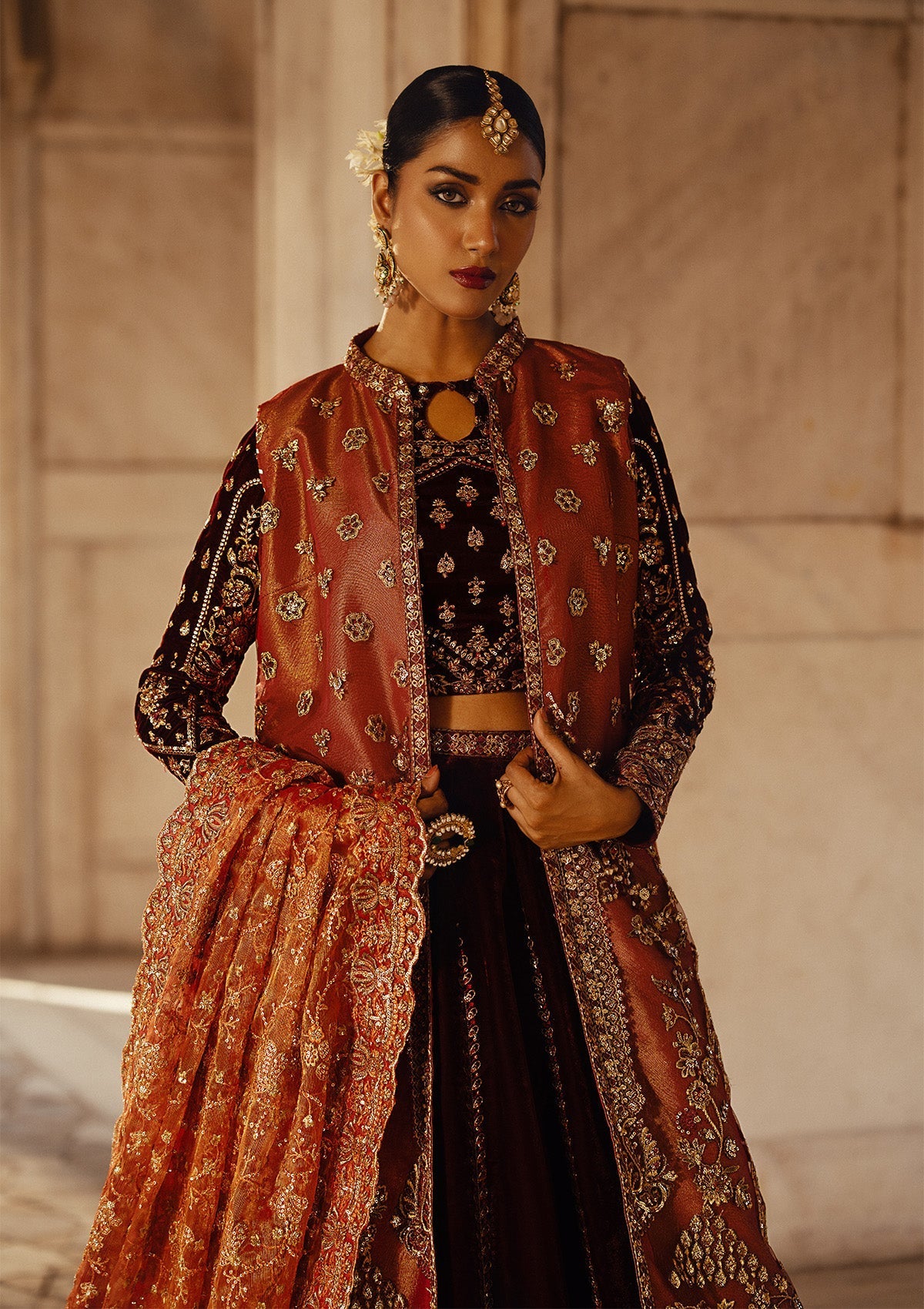Look 06/10 Dastoor?#AIKLuxuryVelvet???4 - A regal ruby velvet lehenga choli. The blouse is embroidered with an elaborate tilla and sequin design, while the lehenga features 16 kaliyan with ornamental motifs on the hem. A sleeveless maroon tulle gown, layered over a two-toned masoori silk underlay, creates a fiery, multi-chromatic effect that enhances the ensemble?? richness. A matching tissue lame dupatta, detailed with a traditional sequin jaal, completes the Look.