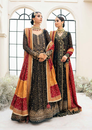 A captivating symphony of black chiffon with an orchestra of antique gold embellishments and intricate beadwork. The base is enriched with sequins shimmering against the self-hued embroidery. Along the border, neckline and sleeves, clusters of ebony beads and gota accents add more dimension to the Look. The final culmination of this breathtaking design is the scarlet silk chaadar with bronzed hems, fashioned in a traditional kamdani style.