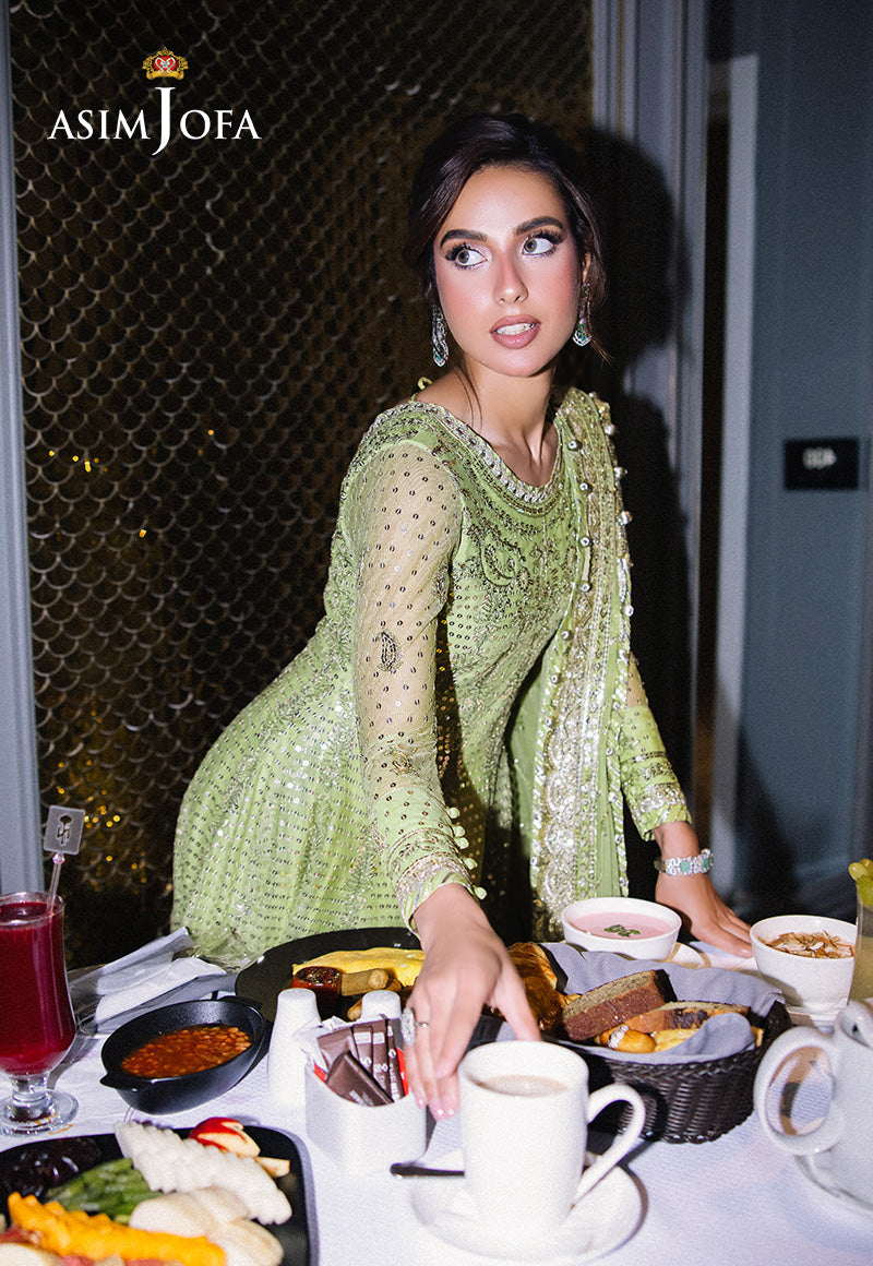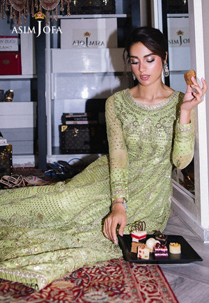 A symphony of grace and opulence, this light green Kalidaar is a vision of timeless beauty. Adorned with glimmering gold lurex and shimmering light gold 5mm sequins, its design captures the delicate dance of light and elegance. Intricate ivory threadwork weaves a story of sophistication, adding surreal beauty to its flowing silhouette. Paired with an exquisitely embroidered dupatta, this ensemble is a testament to refined taste. Perfect for those who seek to blend classic aesthetics with contemporary flair, this Kalidaar is a radiant choice for your most cherished celebrations.