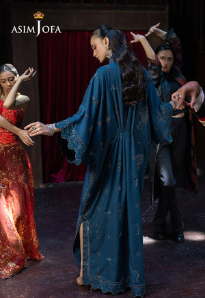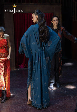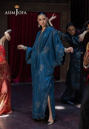Drenched in a mesmerizing shade of teal, this kaftan channels effortless modernity with a hint of mystique. Its flowing silhouette is adorned with two-toned silver zari that catches the light like moonbeams on rippling water, while black sequins add a subtle, night-sky sparkle. Teal threadwork weaves delicately across the fabric, echoing the depth and richness of the hue itself. Striking a perfect balance between contemporary chic and understated glamour, this ensemble is a statement in stillness bold yet graceful.