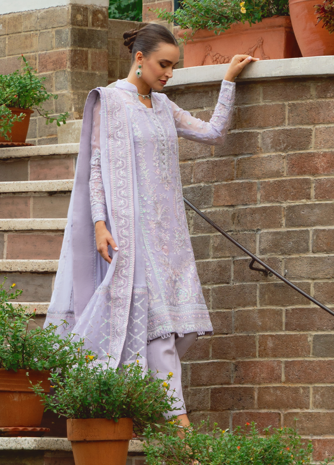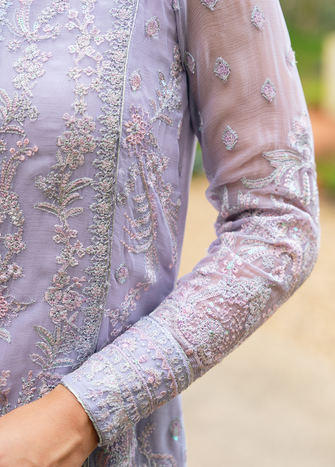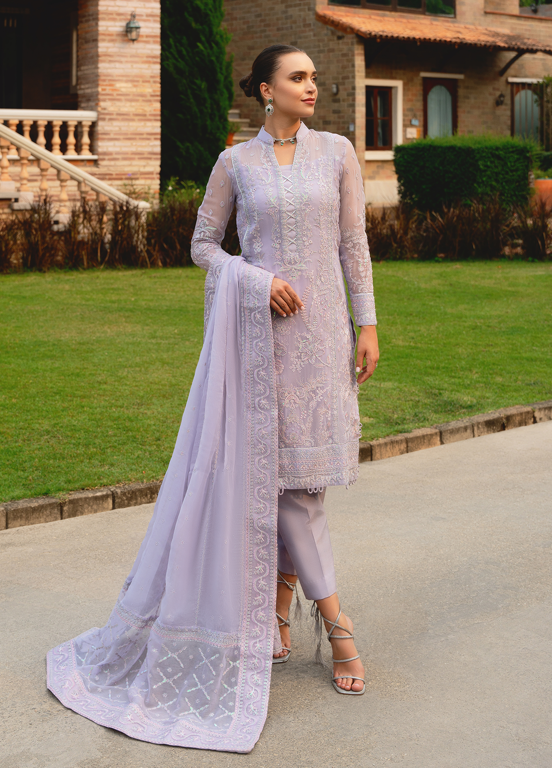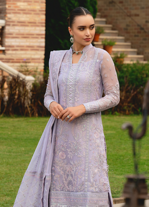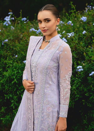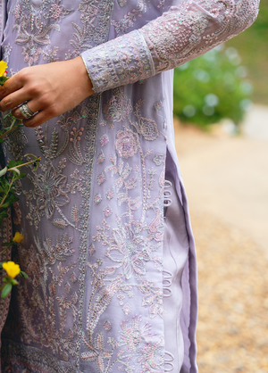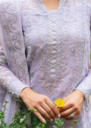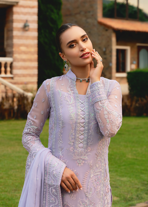 Ariya, from our Embroidered Pret Collection, exudes a soft lilac glow. Intricately embroidered on lilac chiffon, the outfit features a heavily embroidered dupatta with masterfully detailed dupatta pallu extensions, a fully embroidered & sequinned front and fully composed sleeves. Just the outfit to make a statement full of graceful sophistication.