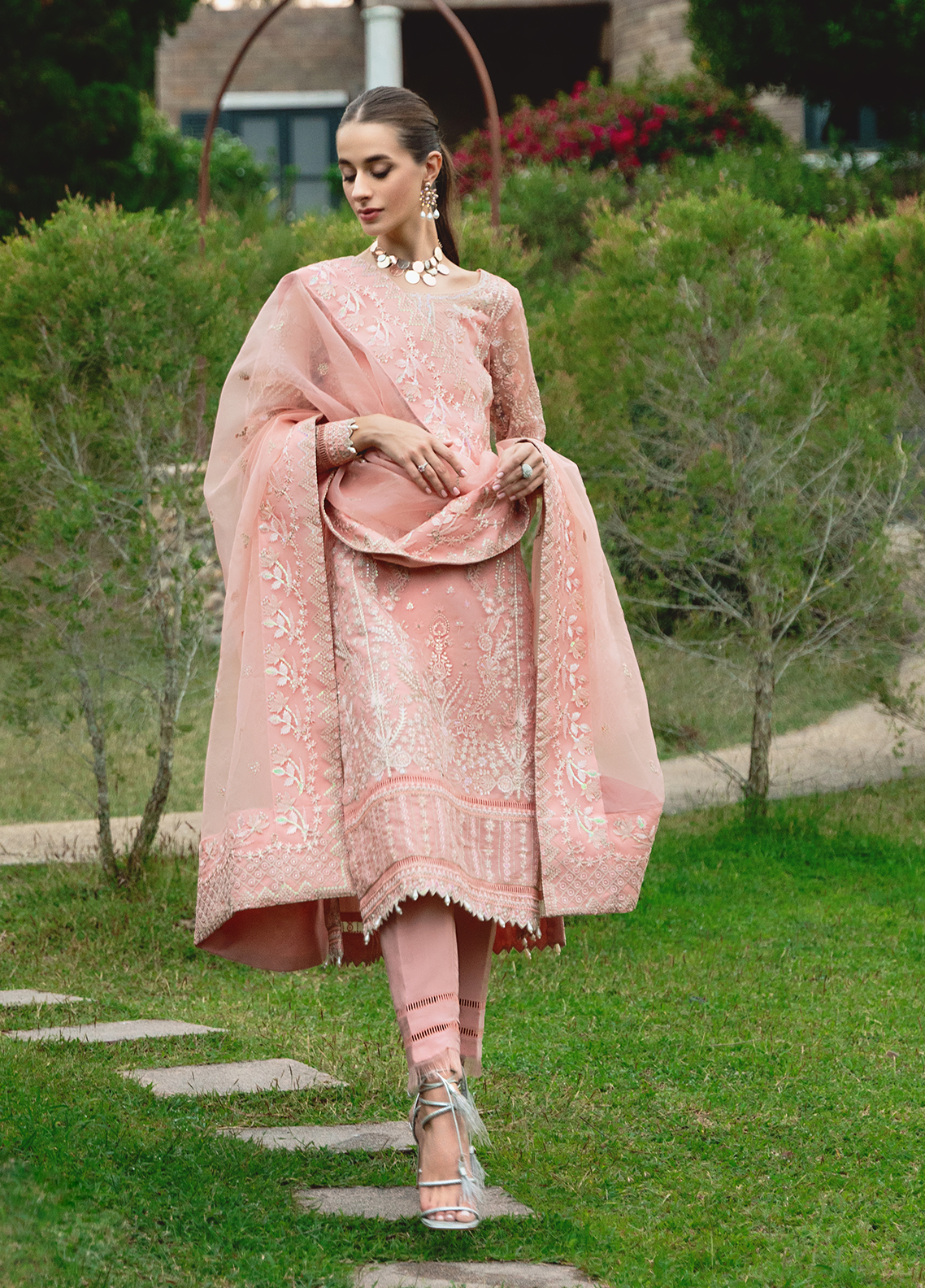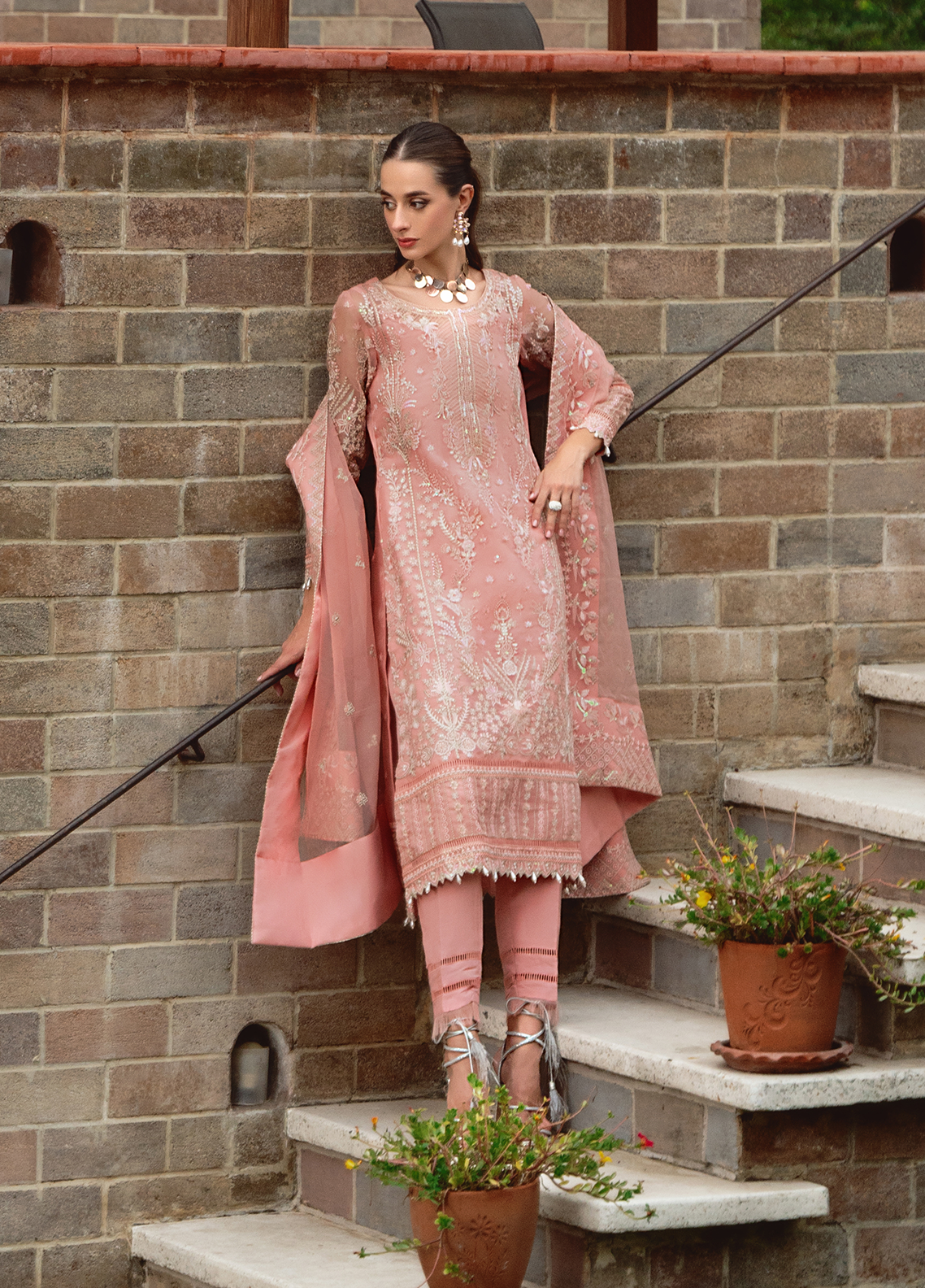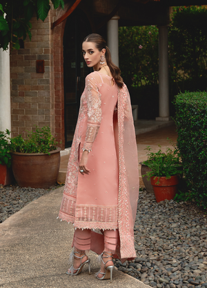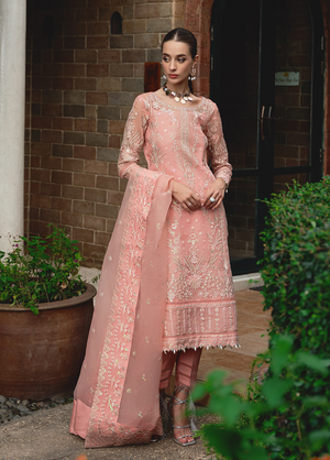 Cressida'embraces the arrival of summer with open arms, radiating a delightful peachy glow. This ensemble exudes luxury, poised to elevate your summer wardrobe with unparalleled elegance. Adorned with intricate embroidery on the front and bordered sleeves, complemented by a stunning peach dupatta and tonal pants, 'Cressida' is an essential addition to your seasonal attire.