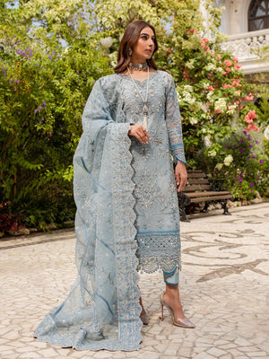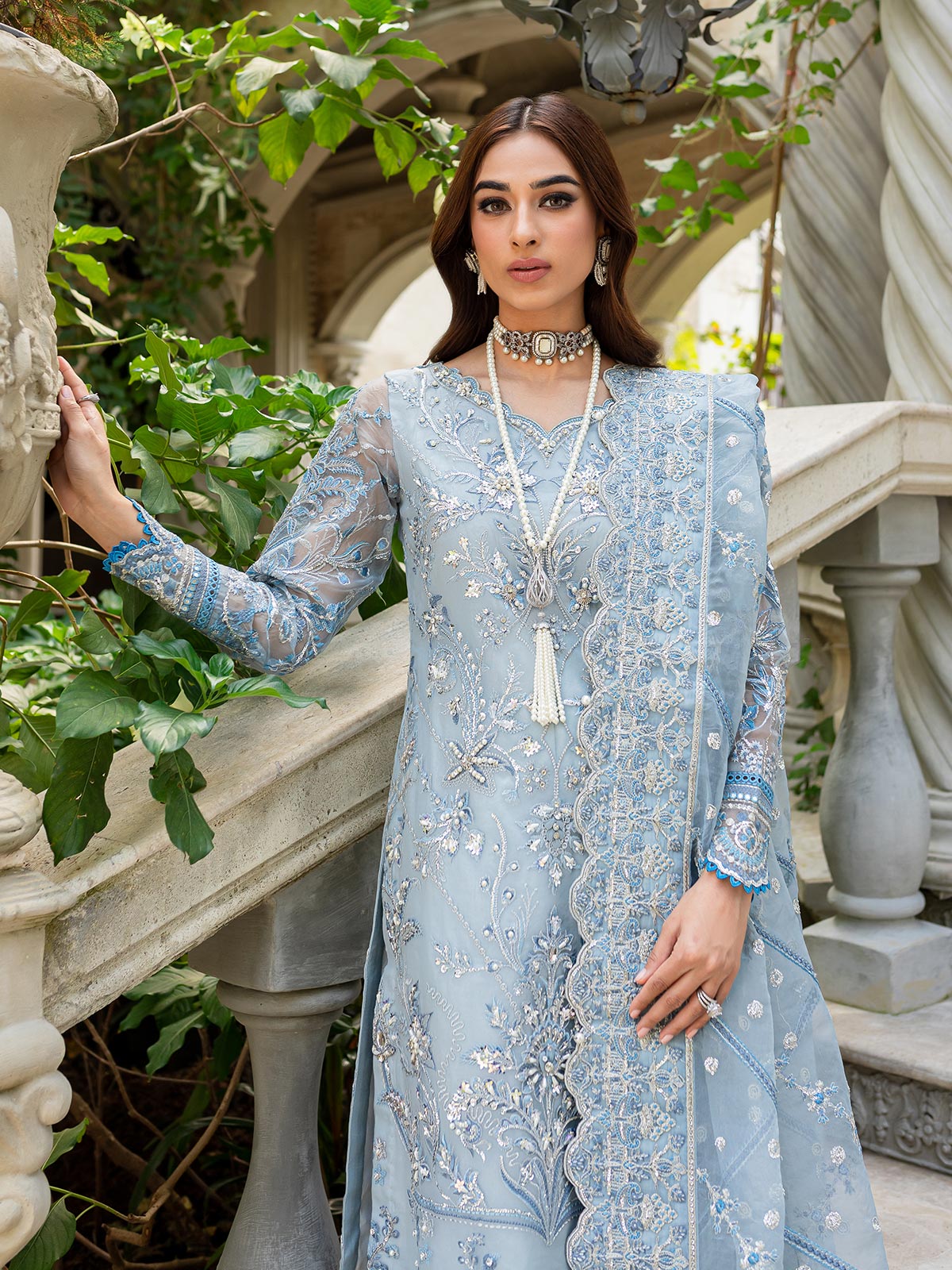 Estirah, GL-LP-V1-02 from our made-on-order luxury pret collection, is put together on a pale ice blue organza base. The shirt? front is heavily hand-worked and features sheesha-work on the borders. Rendered in shades of silver zari, the design also incorporates the technique of chikankaari on the borders. The dupatta is a mix of floral patterns spread out across the diagonal lines, embroidered in silver zari & embellished with silver koli sequin, running throughout the dupatta