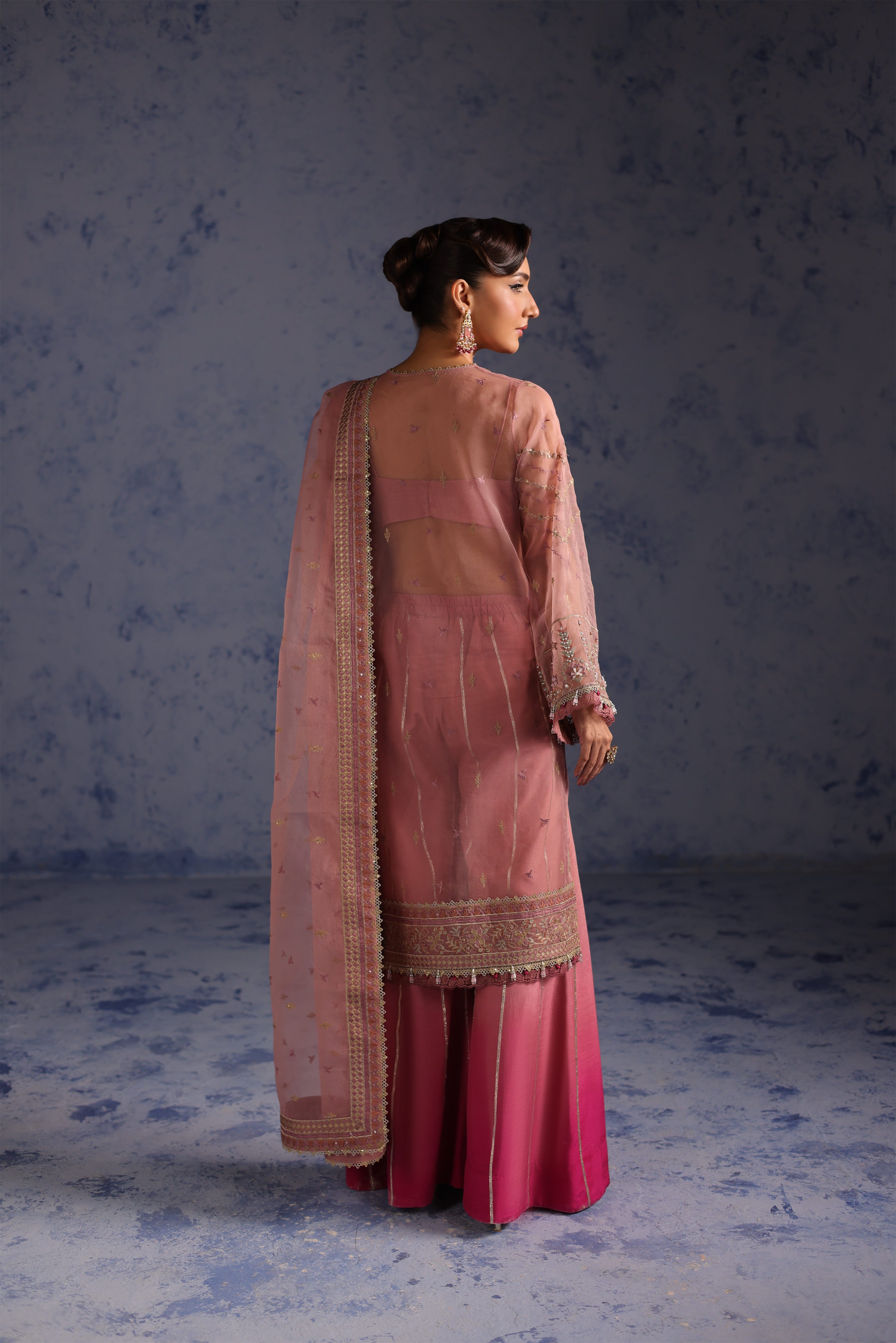 Perfect for festive occasions, weddings, and elegant soirées, this ombre pink ensemble embodies timeless femininity, refined embellishment, and modern eastern sophistication.
