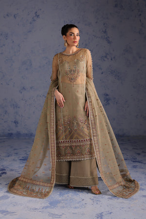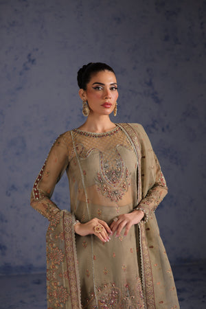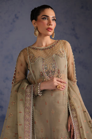 Paired with an embroidered organza dupatta, showcasing exquisite artistry, and a dyed raw silk trouser with coordinated lining fabric, this ensemble offers both structure and fluidity.