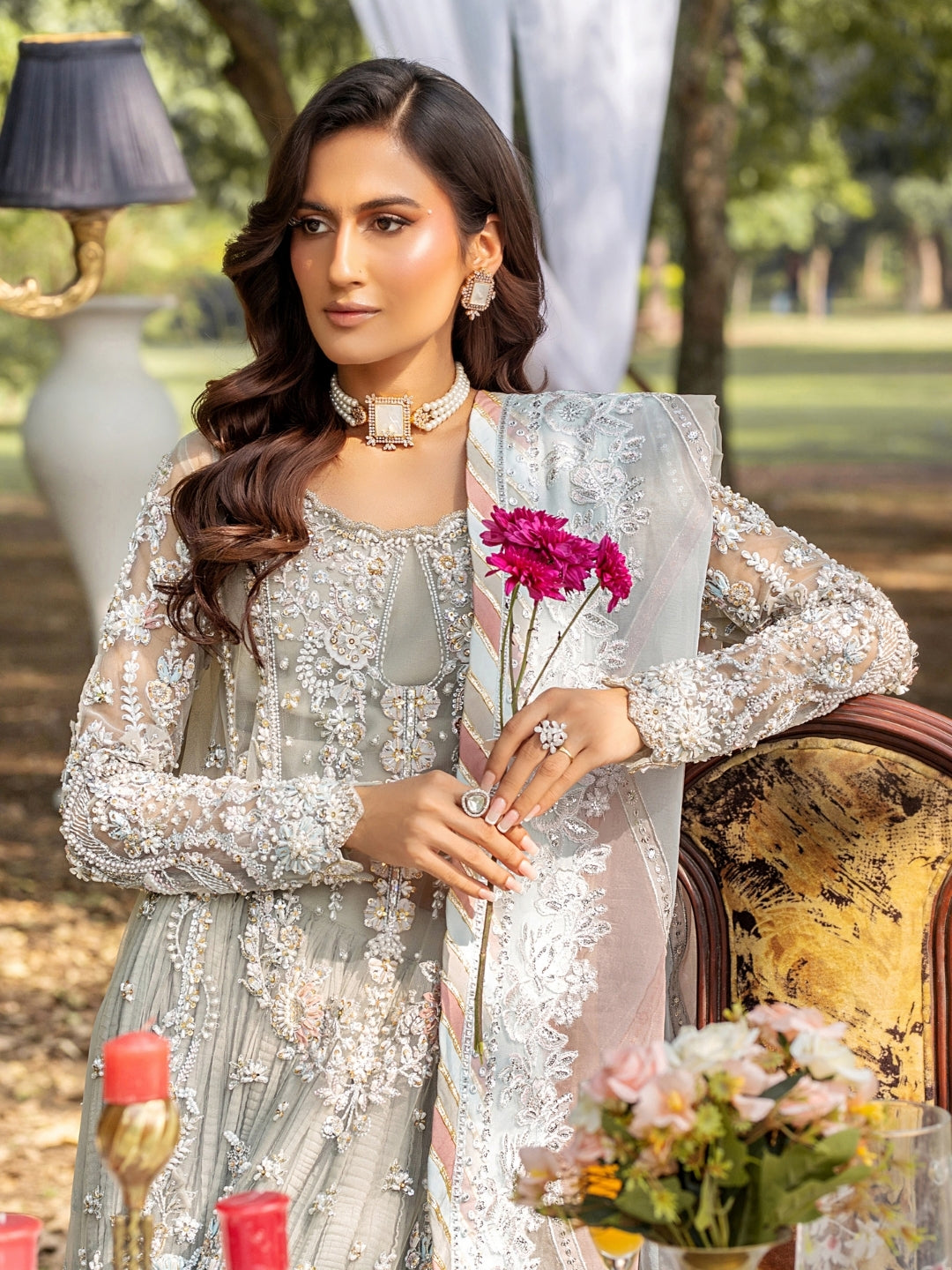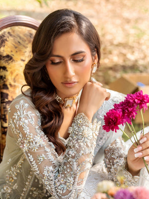 This stunning shirt features intricate embroidery and 3D fabric flowers, hand crafted fabric petals, pure crystal, swarovski, dabka, naqshi, and Sequin accents on the front, crafted from delicate net fabric adorned an organza embellished hem. Fitted sleeves that feature intricate, three dimensional floral pattern created using fabric manipulation, beads, dabka, and crystal. Paired seamlessly with a crushed sharara, the outfit is completed with a three-tone laser organza dupatta featuring an intricately embroidered border in classic Chatta Pati style. Elevate your formal wardrobe with this timelessly elegant design.