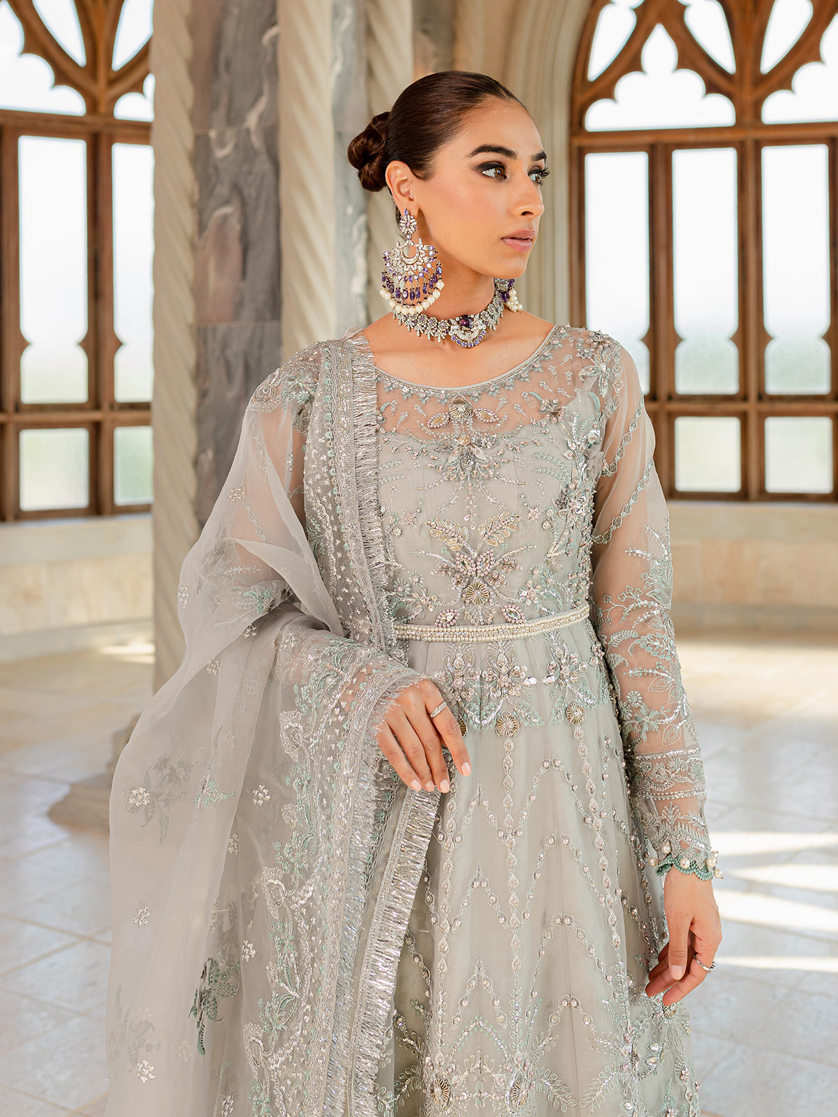 Naimaah, item code?GL-LP-V1-07?from our made-on-order Luxury Pret collection, is a fully hand-worked and luxuriously embellished pishwas with 12 fully composed panels attached to a stunning composed bodice. Featuring thread work in similar shades of dull green with accents of silver zari, the outfit is just the right choice to wear at any wedding function. The dupatta is fully embroidered and sequined as well, on a dyed organza base.