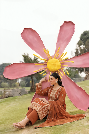 Elegant womens 3-piece unstitched embroidered suit featuring a beautifully detailed shirt and matching dupatta. Paired with a plain trouser, perfect for a graceful everyday or semi-formal look.