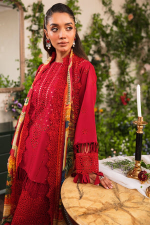 The "Vine" dress in a rich crimson red exudes refined elegance with its monochromatic tone-on-tone details, creating a sophisticated and seamless look. The short shirt is enhanced with modern elements on the sleeves, contemporary touch to the classic design. Paired with straight pants for a sleek, streamlined silhouette, the outfit is completed with a matching soft printed dupatta, which introduces a subtle pop of vibrancy.