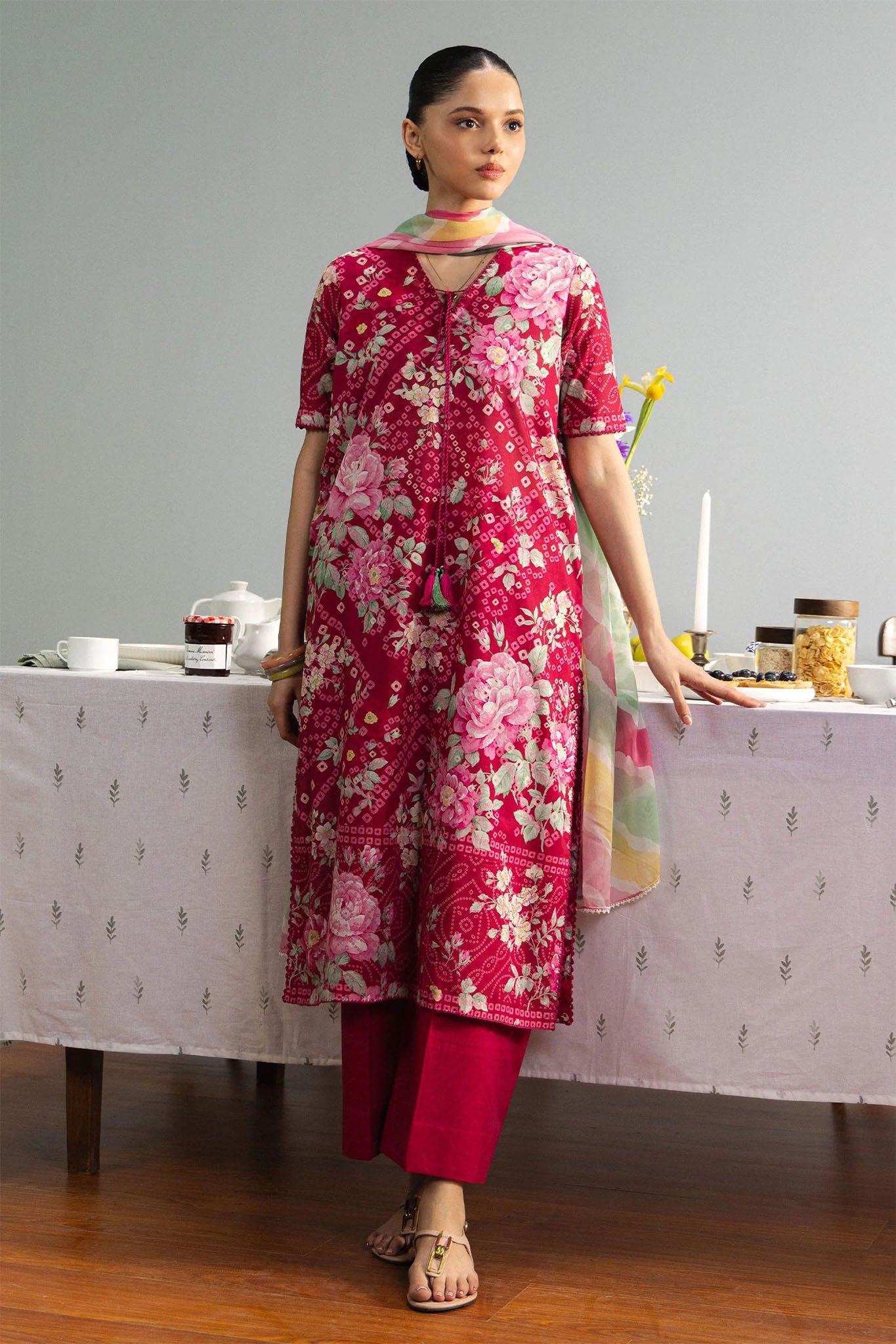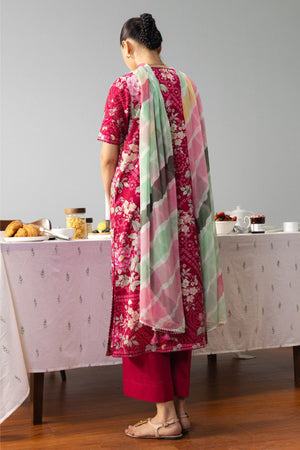 Bold and expressive, this magenta design features lush floral bouquets layered over subtle geometric textures. A vibrant striped dupatta completes the look with a contemporary, statement-making finish.