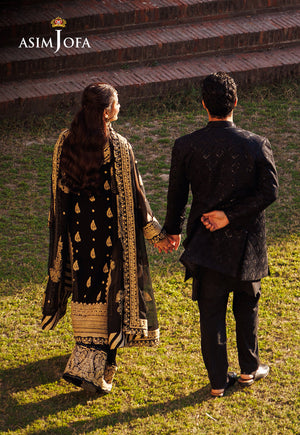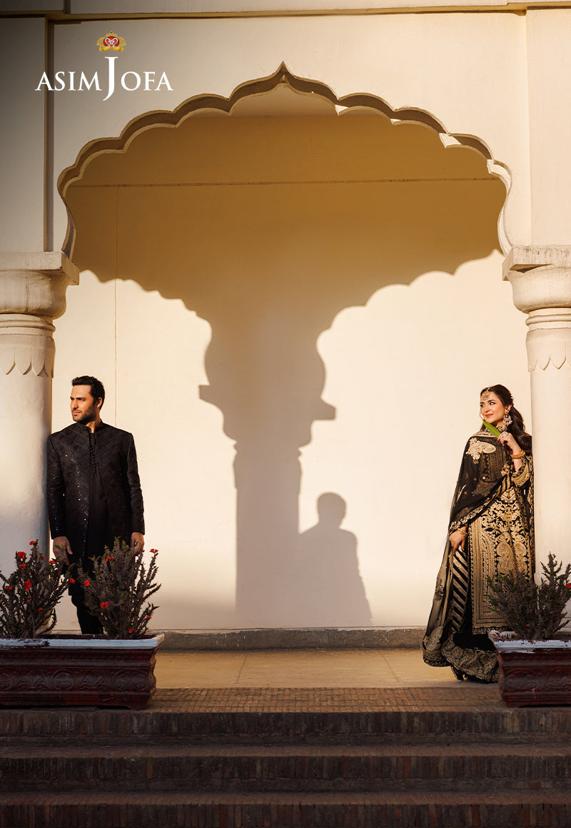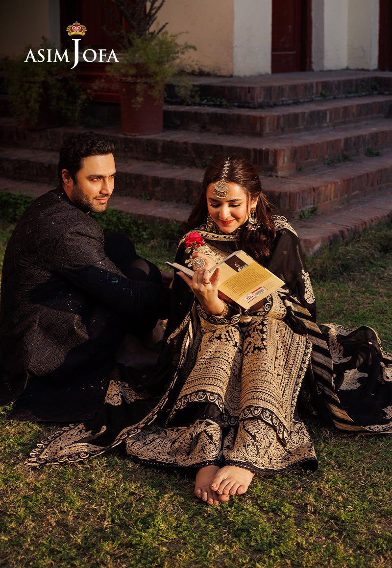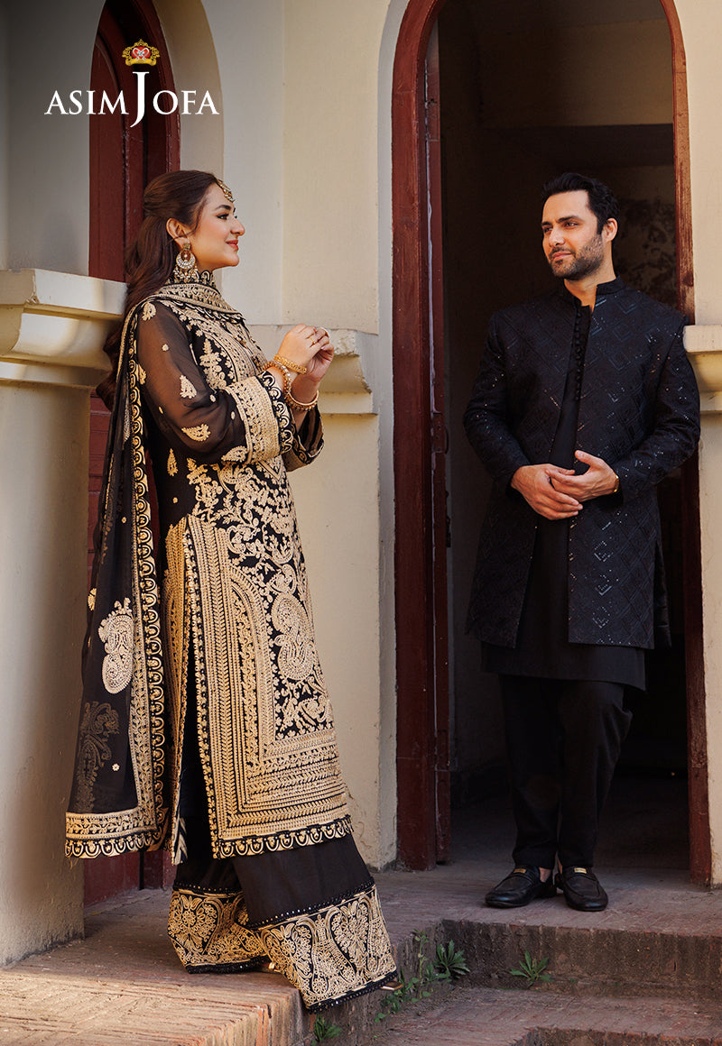 Dive into the Onyx glamour with our divine black ensemble from Asim Jofa's "Chikankari" Eid collection where each embroidered stitch is a whisper of opulence and grace. The dark gold aari stitch entwined with gold lurex and gold zari threads creates a celestial aura adorning the outfit including, chaak, daman borders, sleeves, dupatta, and trouser borders like constellations, weaving a tale of elegance and allure.