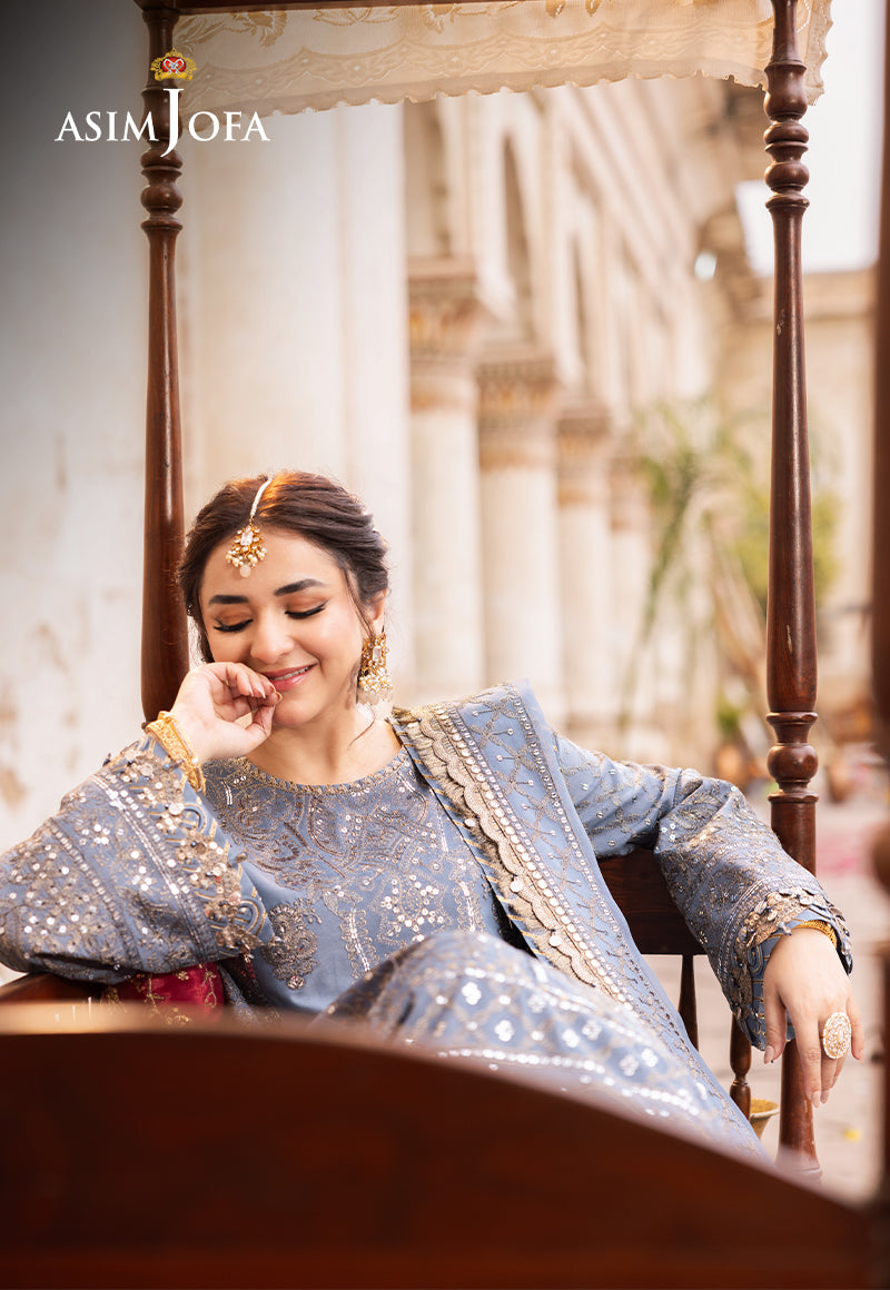 Envelop yourself in the enchanting hues of bluish grey with this kalidar outfit, a masterpiece from Asim Jofa's "Chikankari" Eid collection. The embroidered details like whispered secrets adorn every inch with grace and elegance. The two-toned mink color zari and gold sequins sparkle adding a celestial aura to the traditional silhouette. With motifs on the dupatta reminiscent of timeless tales, this outfit is a blend of nostalgia and modern allure.