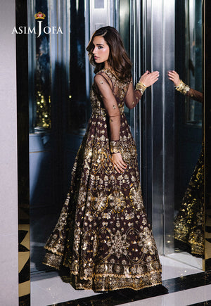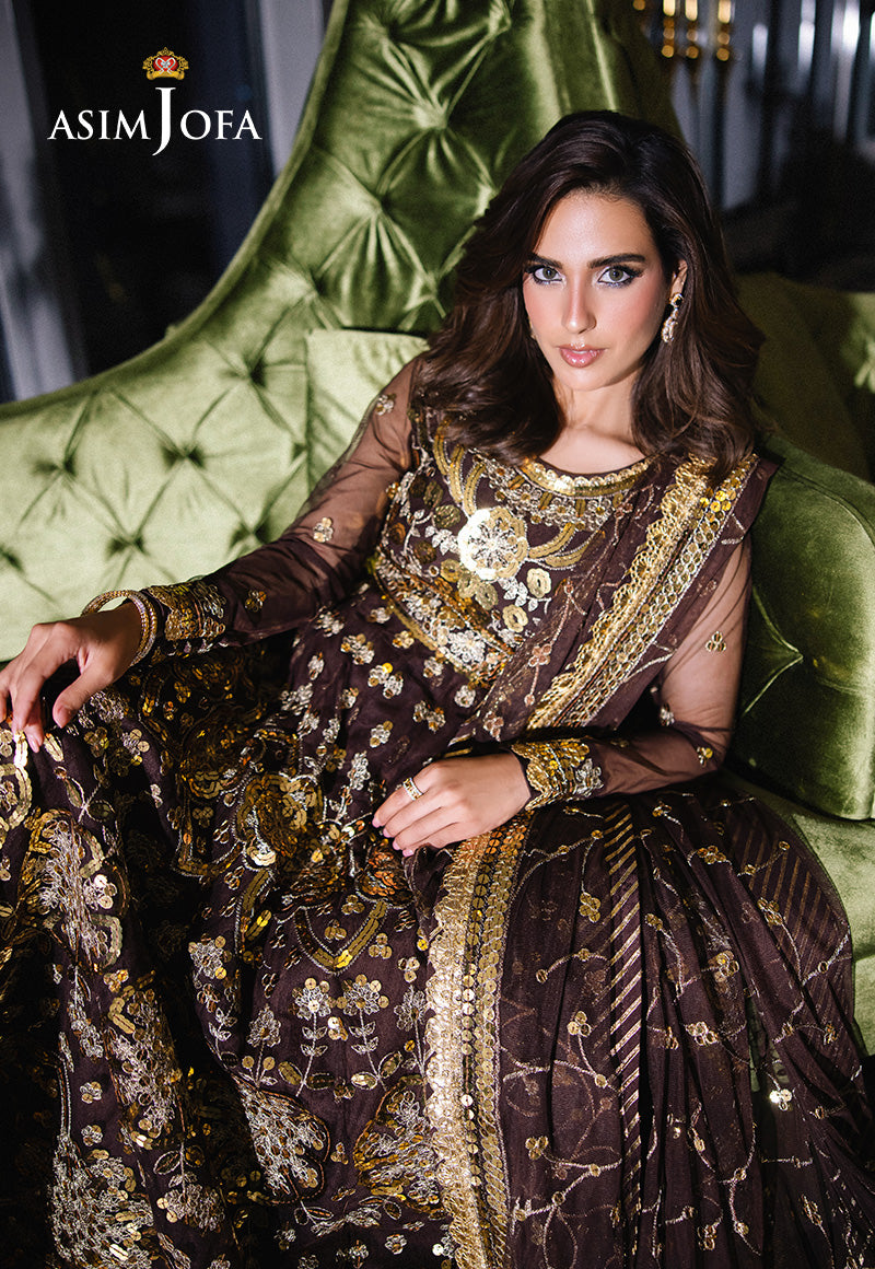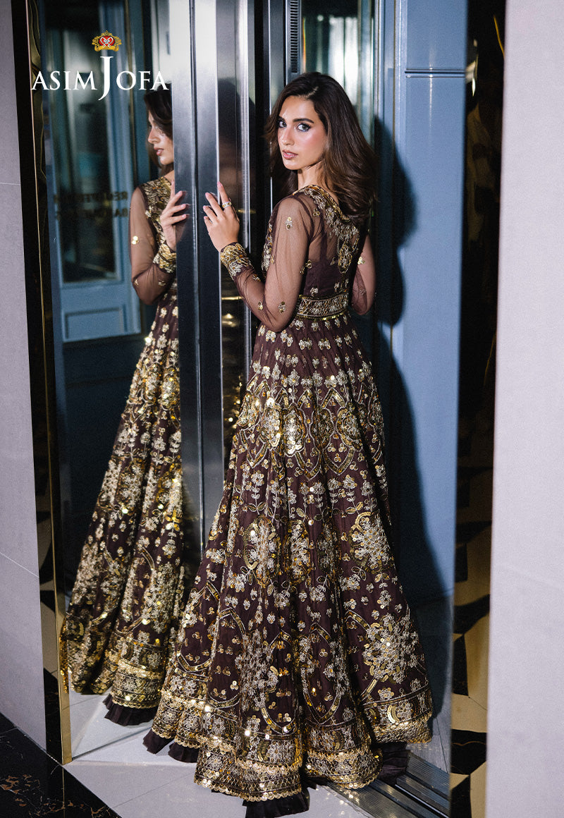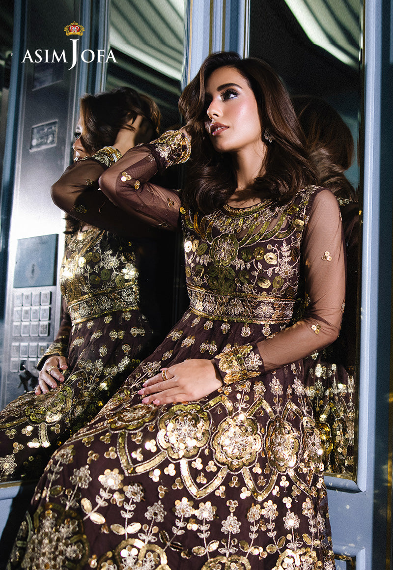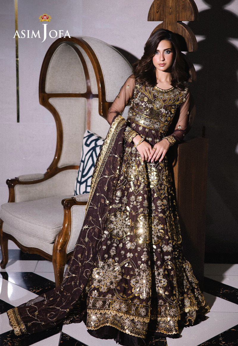 Radiating timeless allure, this brown long-flared peshwas is a true testament to royal sophistication. The bodice and voluminous silhouette are intricately adorned with glimmering 9mm gold sequins and gorgeous gold zariwork, creating a mesmerizing visual of texture and shine. The lavishly embroidered dupatta completes the look, adding layers of elegance and finesse. This ensemble is a showstopper for any grand celebration, designed to leave an unforgettable impression.