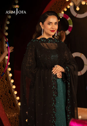 Striking and statement-making, this emerald green and black outfit is the epitome of modern opulence. The sequin-spangled emerald shirt shimmers with every movement, acting as a radiant base for the intricately crafted black waistcoat layered above it. Adorned with exquisite cutwork and delicate 3D detailing, the waistcoat brings bold structure and rich texture to the ensemble. The shirt’s scalloped hem adds a graceful finishing touch, echoing the finesse seen throughout. Paired with embroidered trousers that mirror the cutwork and 3D embellishments, this look is an unforgettable fusion of shimmer, structure, and sheer sophistication.