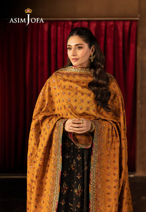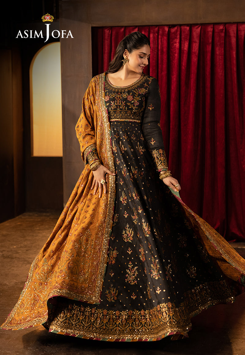 A vision of ethereal grandeur, this black pishwas embodies regal elegance with every thread. The flowing silhouette is brought to life with breathtaking embroidery in antique gold zari and sequins, while ochre, magenta, and sage green threadwork adds layers of richness and charm to the design. The ensemble is elevated by a contrasting mustard dupatta styled like a shawl—lavishly embroidered with multihued threadwork and sequins, it drapes with a majestic flair. This look is a tribute to timeless splendor, made for moments that call for unforgettable presence.