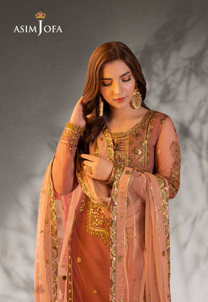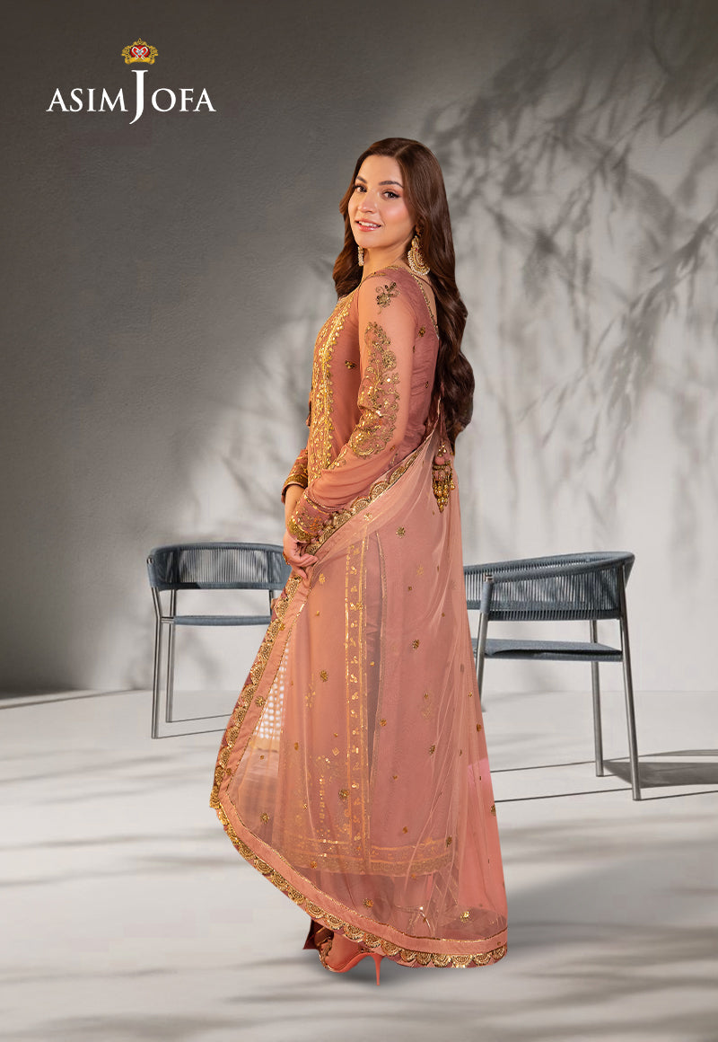 Experience the joy of celebration with Asim Jofa’s “Jag Mag Collection” featuring this outfit which is designed to make you shine like never before with its intricate embroidery and luxe designs that exude glamour and jovial vibes. The copper base of the outfit is complemented by a peach dupatta creating a vibrant contrast that is perfect for any festive occasion. The neckline and grand borders are adorned with antique gold zariwork and 5mm gold sequins adding an extra layer of elegance to the ensemble. The dupatta is also embroidered completing the look with a touch of sophistication.