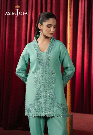Embrace a vision of contemporary charm in this light green ensemble, where modernity soars in the design. The cape-style shirt flows effortlessly, adorned with intricate silver zari and shimmering silver sequins that add a touch of radiance. Delicate light green threadwork enhances the design, creating a harmonious blend of texture and sheen. Paired with beautifully embroidered trousers, this ensemble is a statement of refined grace, perfect for those who appreciate effortless sophistication.
