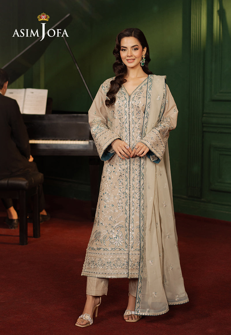 Timeless sophistication gets redefined in this beige ensemble. The stunning embroidered shirt glows with all-over zariwork, accented by aqua blue threadwork and light gold cupped sequins, creating a stunning interplay of shimmer and color. A flimsy embroidered dupatta completes the look, adding an airy elegance to this refined masterpiece.