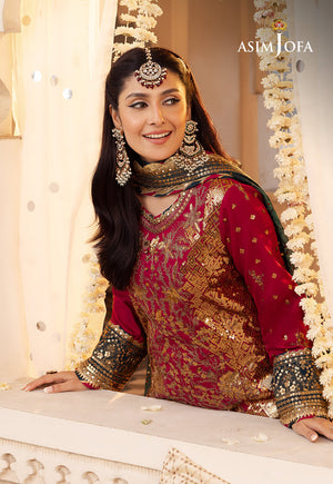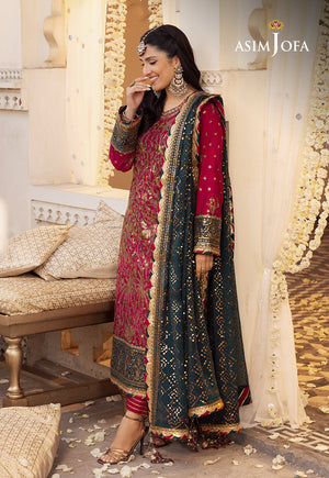 Enchant the festivities with this "Teal-Infused Blossom" from Asim Jofa's Shehnai Collection. This deep pink ensemble adorned with golden zariwork and 5mm sequins blooms into a vibrant celebration. The teal sleeves and daaman border provide a refreshing contrast while the meticulously embroidered patterns on the shirt and dupatta are like the petals of joy. Elevate your festive spirit with this exquisite piece that's a blossom of elegance.