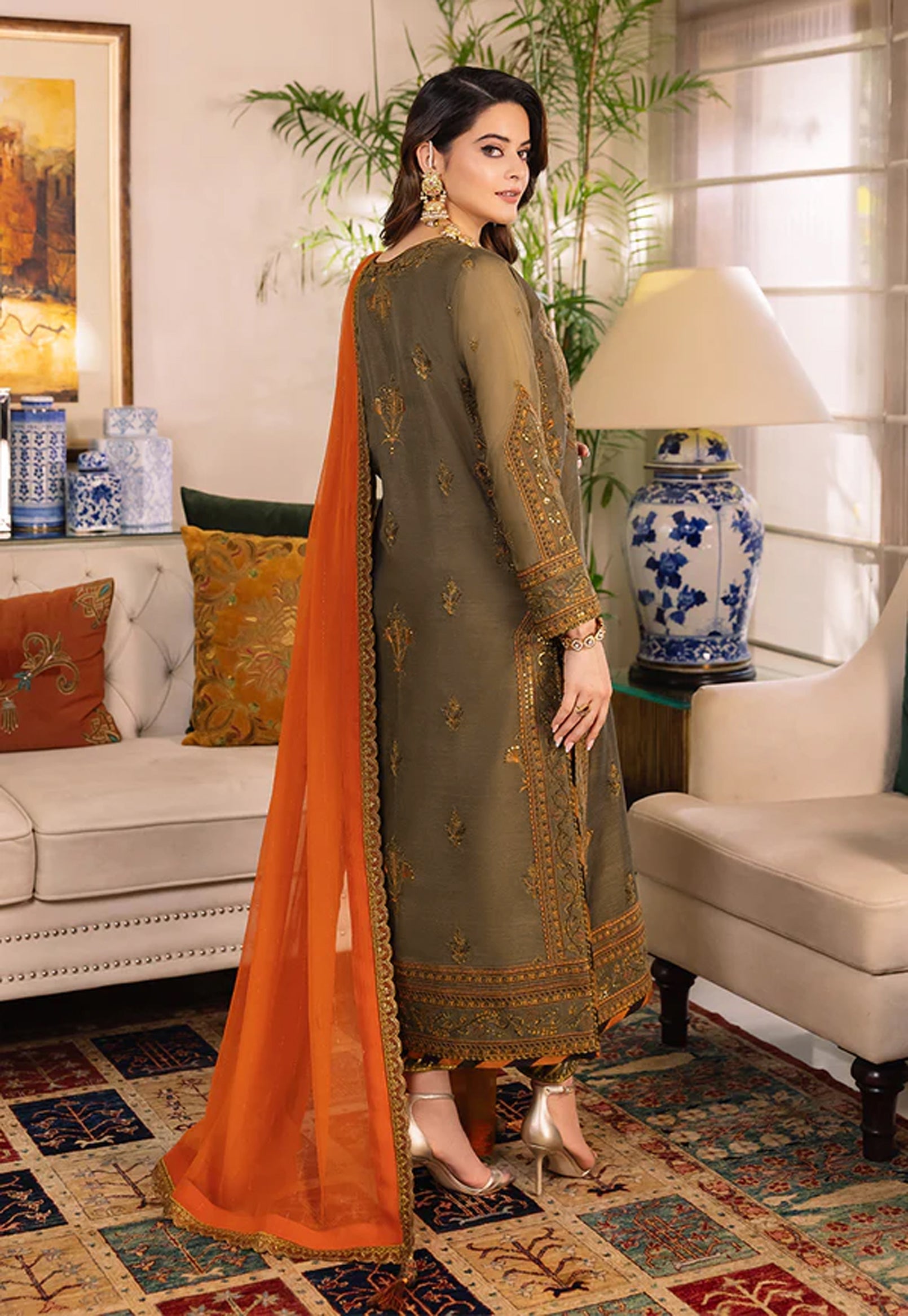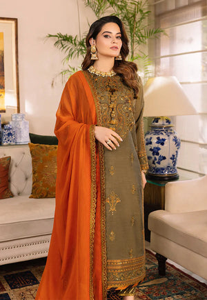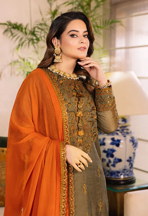 Bring to life your most elegant and poised self with this soothing Moss green ensemble, designed in the most stellar way with embroidery of sunset shades together with a vibrant tangerine dupatta. This classy piece highlights the characteristics of regality. Stay as chic as Minal Khan by grabbing up this piece of 'The Noorie'.