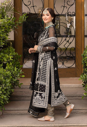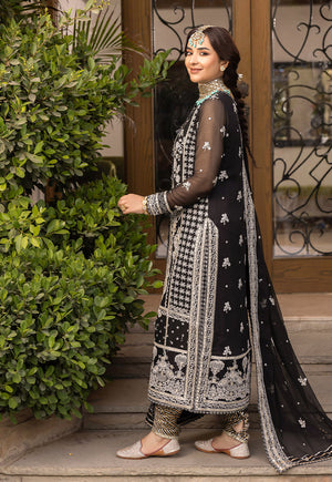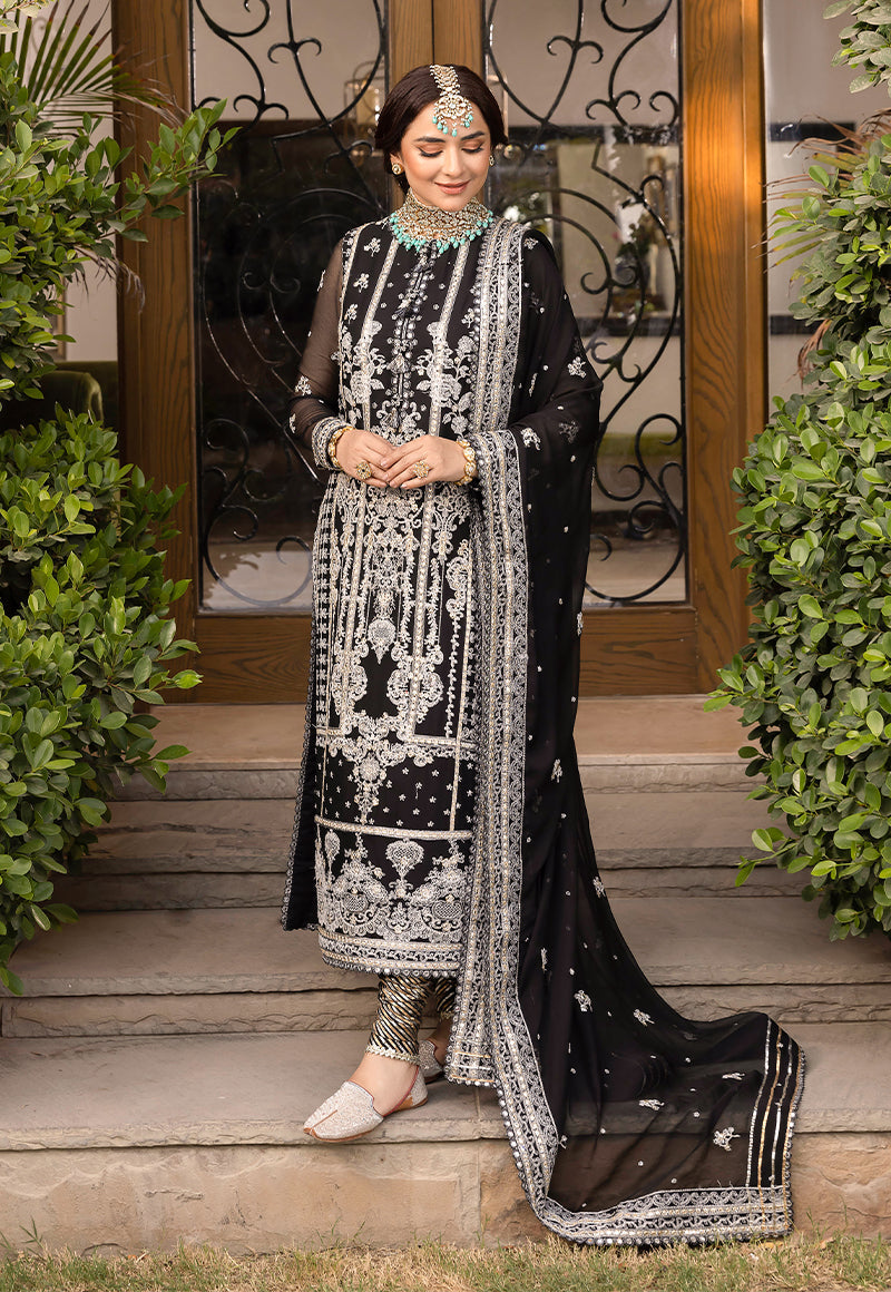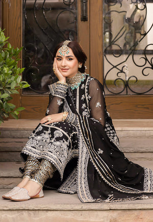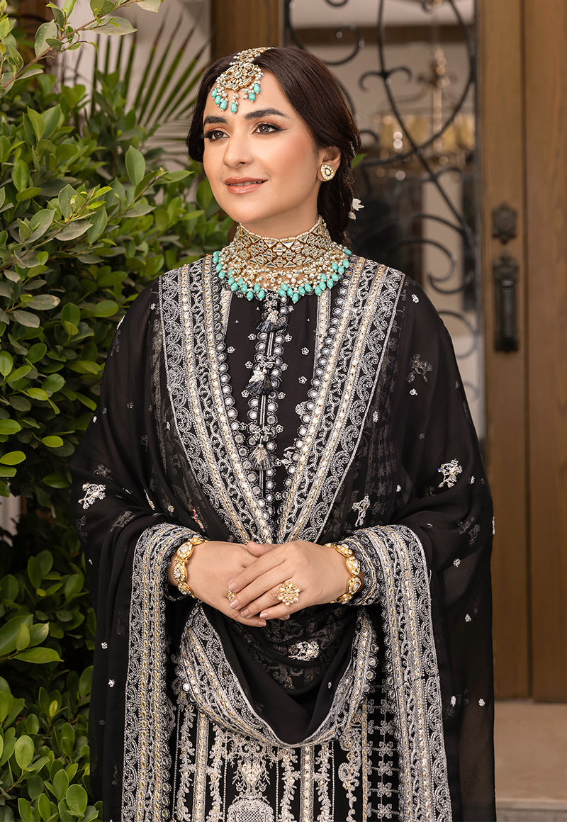 Yumna Zaidi brings her bold and confident energy to ‘The Meerub’ by Asim Jofa. This black beauty features glorious silver embroidery and fleecy fabrics that are sure to turn heads. The heavy zari work on the long shirt, embroidered sleeves, and dupatta add a touch of flamboyance to the outfit. The churidar trouser and keyhole back detail create a sleek and modern silhouette. This magnificent ensemble is the epitome of elegance and sophistication, ideal for any formal occasion where you desire to make a bold fashion statement.