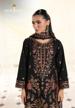 Modern, magnetic, and undeniably chic—this black ensemble reimagines florals with a fierce sophistication. The shirt showcases an elaborate foliage-inspired embroidery, brought to life with rich cherry red, soft peach, and leafy green threadwork, all softly illuminated by light gold sequins. The design flows seamlessly into embroidered shalwar, extending the visual story with refined cohesion. Paired with a beautifully embroidered dupatta, this look is for the woman who blends bold artistry with effortless elegance.