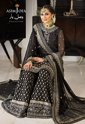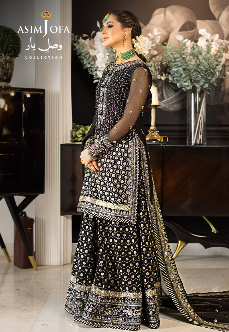 Experience the heavenly allure of this Enigmatic Noir number from “VASL-E-YAAR†collection. The ensemble flows around you, creating a graceful and elegant look. The shirt cascades gracefully, lending you a look of effortless elegance, complemented by the traditional charm of the Dhaka pajama. Embrace the timeless beauty of the delicate chaak border, and complete the celestial vibe with the chiffon dupatta adorned with matching embroidery.