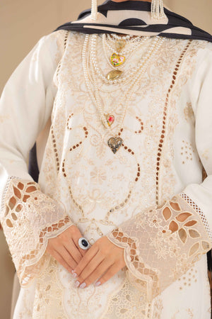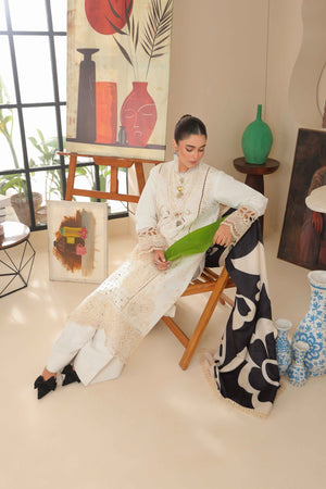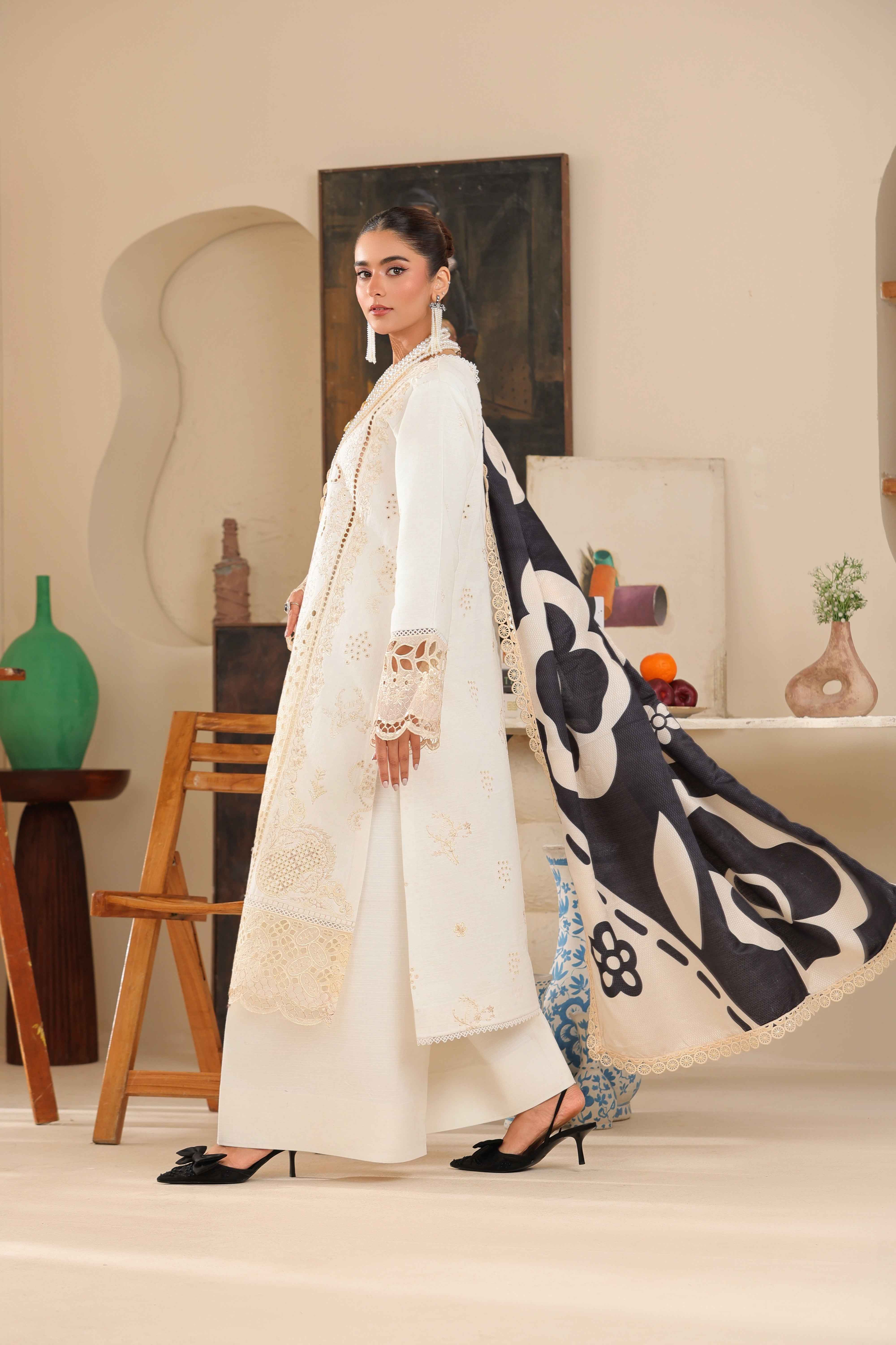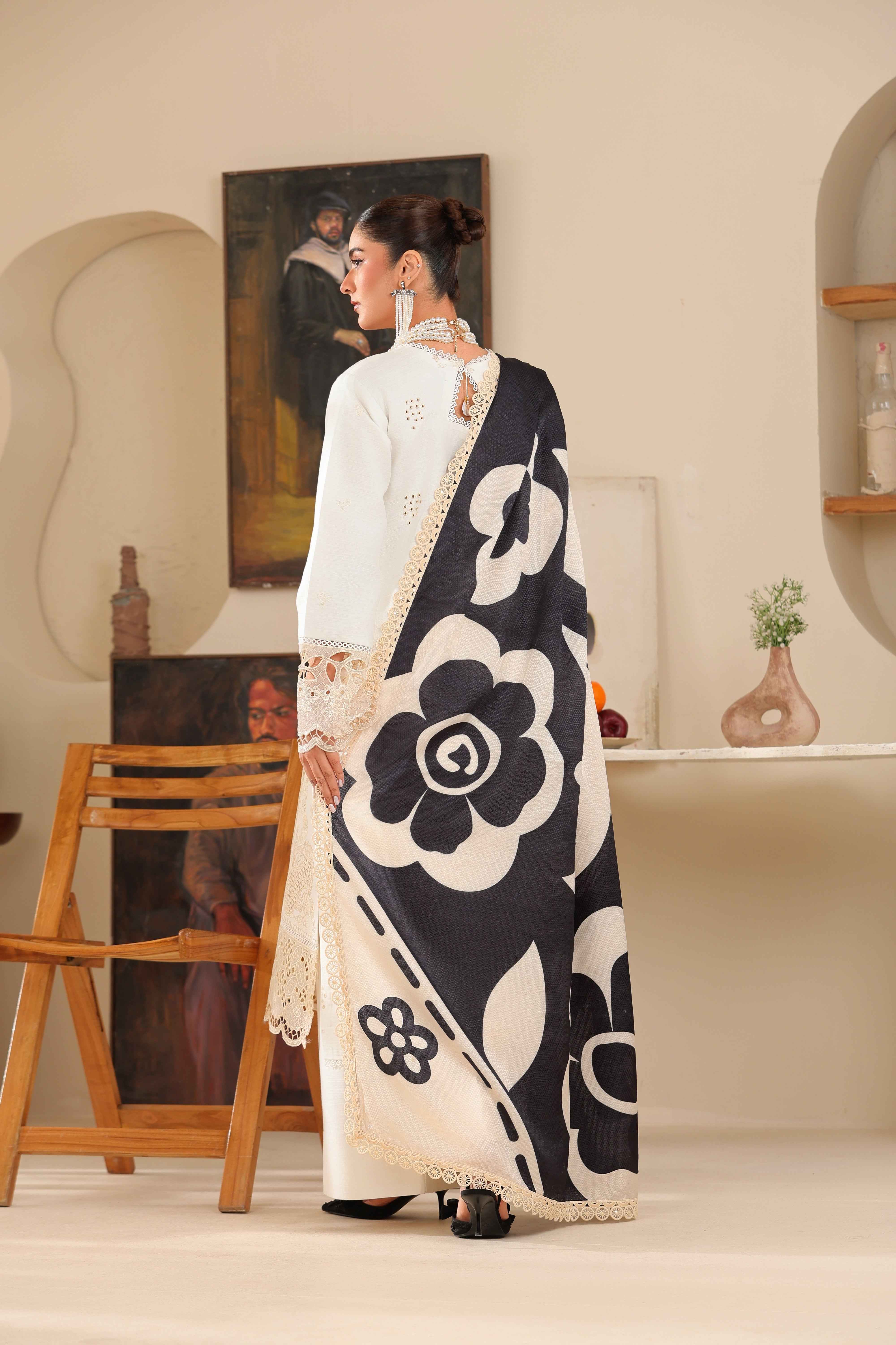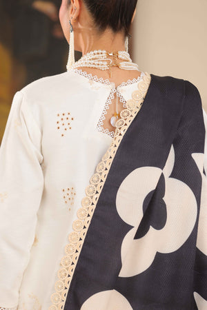 A classic off-white canvas, elevated with intricate embroidery masterpiece of slub khaddar dobby net brings timeless charm with luxury embroidery & a printed shawl