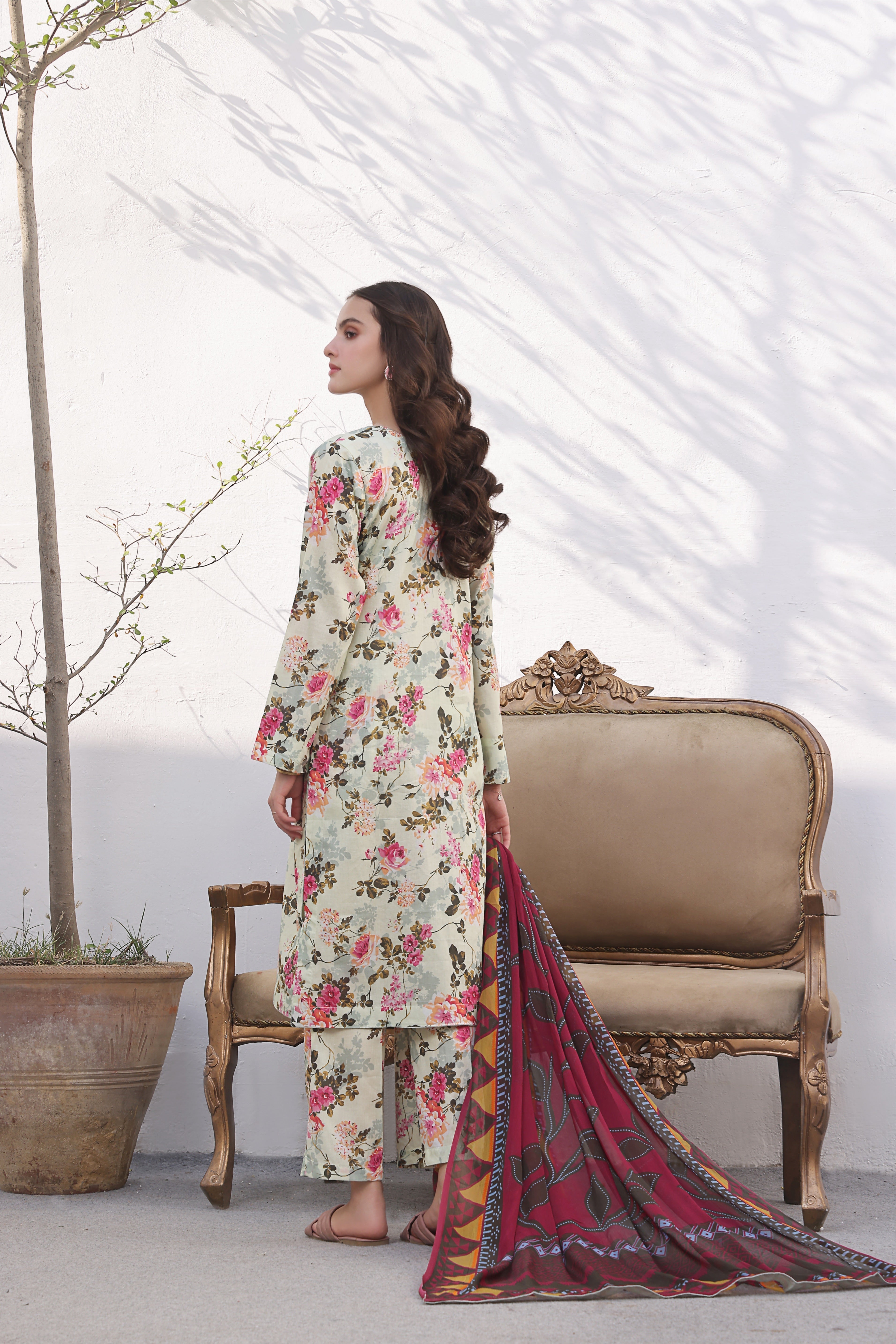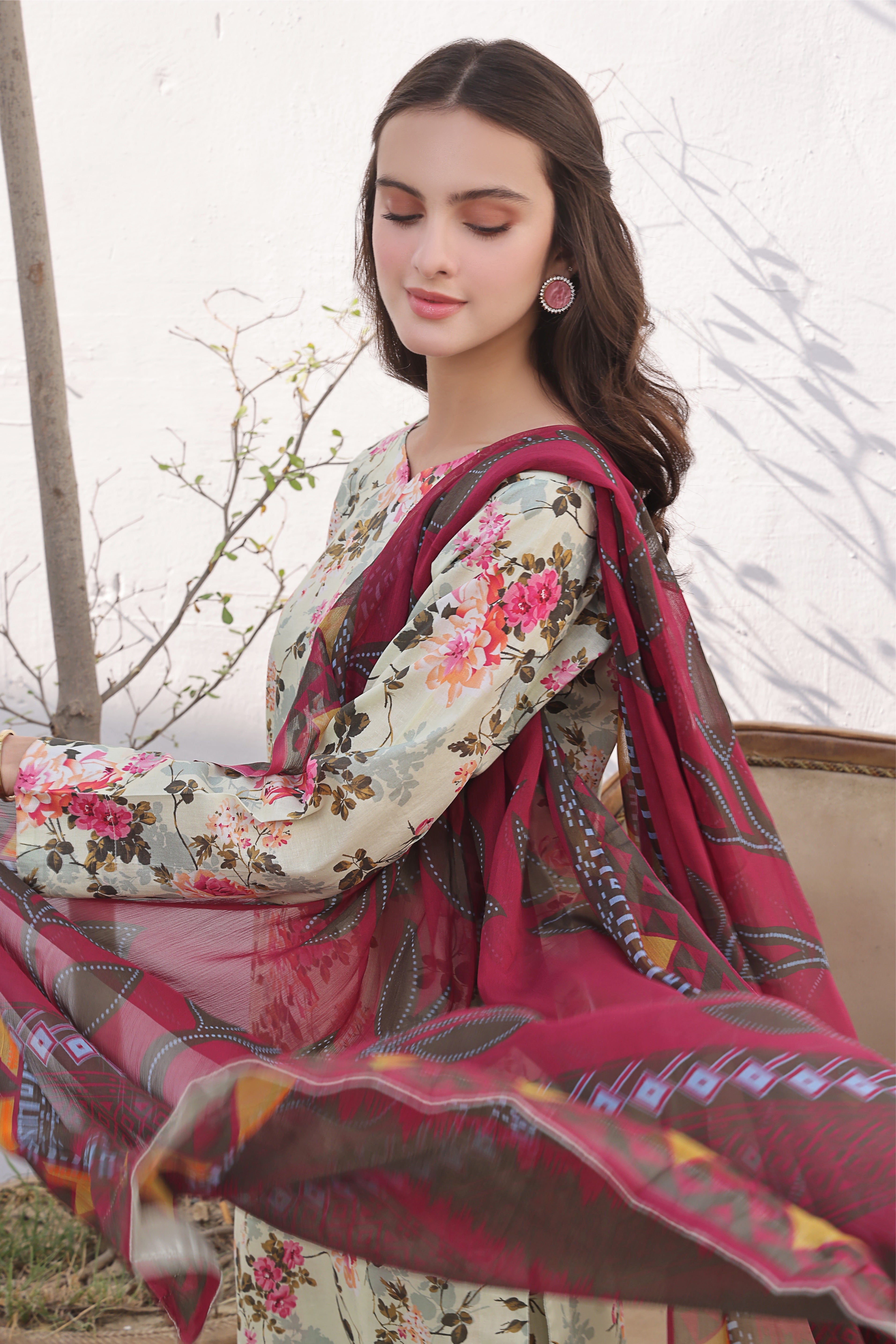 Experience ExquisitelyThis dress is for a new go this summer.The article includes:Unstitched 3PCDigital Printed Shirt (3 yards)Digital Printed Trouser (2.5 yards)Digital Printed Chiffon Dupatta (2.5 yards)Fabric Type: Lawn