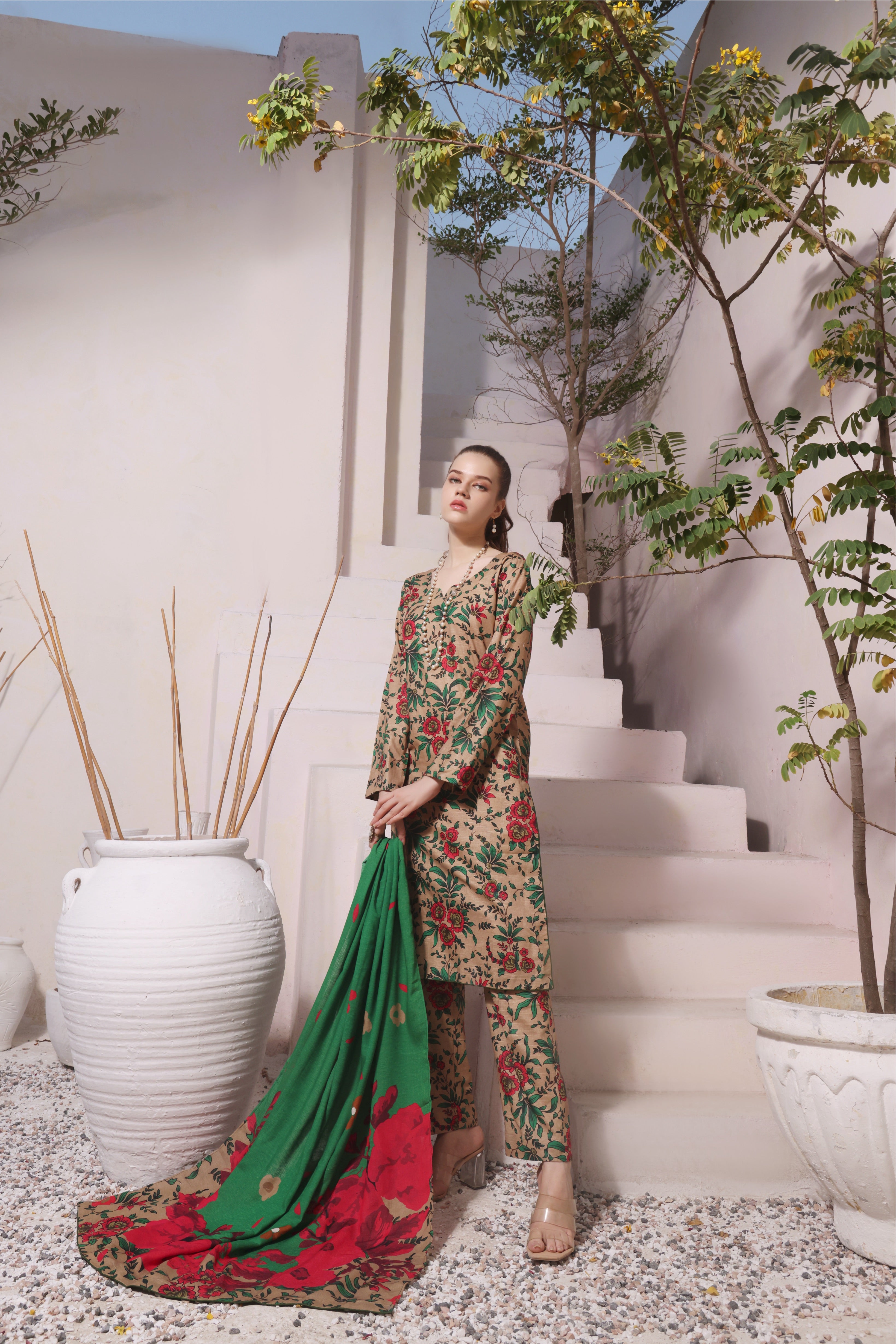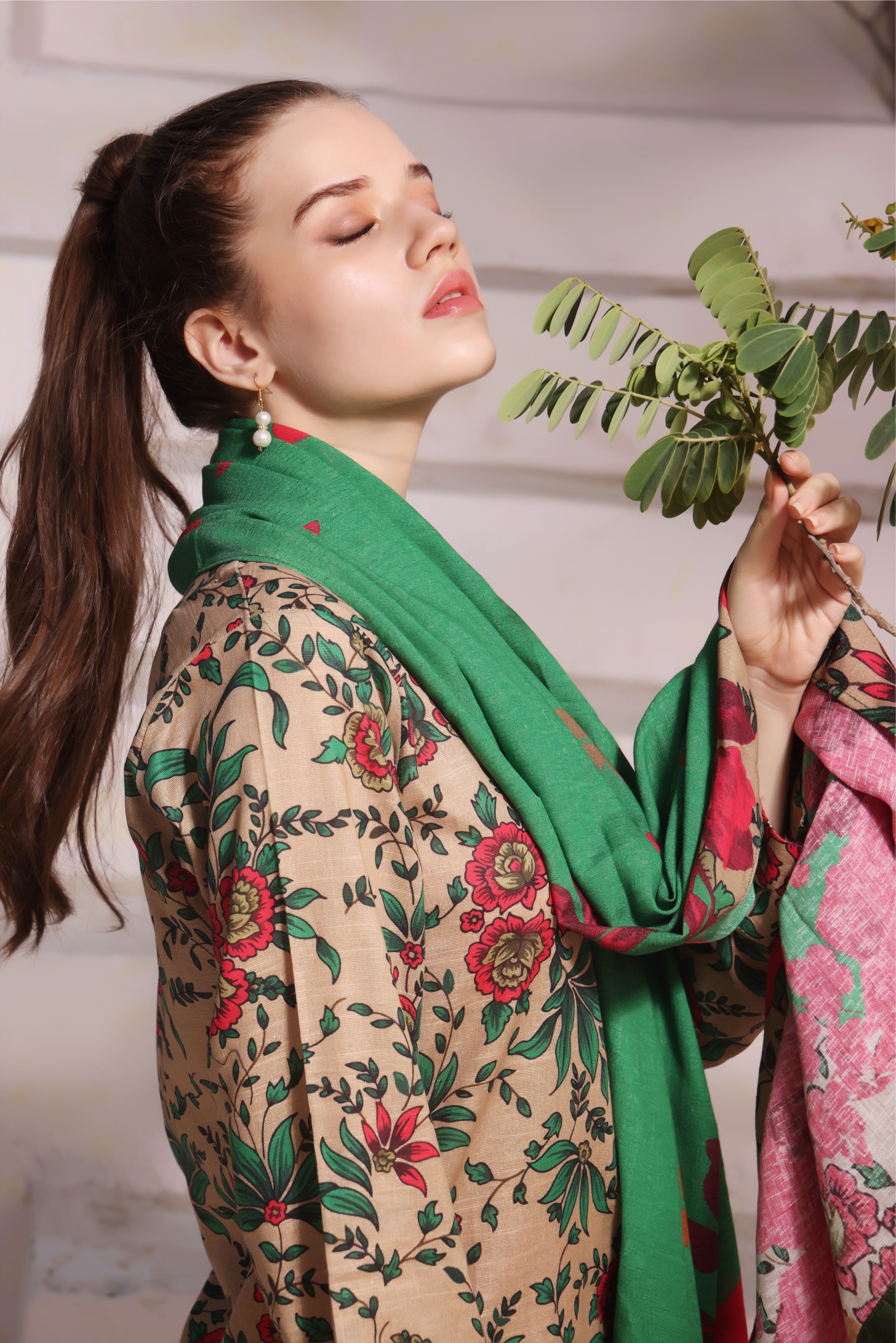 Experience an exquisitely (Unstitched) Digital Printed Dhanak shawl with a Digital Printed Dhanak suit for a new go this winter season.The article includes:Digital Printed Dhanak Shawl: 2.5 yardsDigital Printed Dhanak Shirt & Trouser Fabric: 5.4 yardsDISCLAIMER: COLORS MIGHT APPEAR SLIGHTLY DIFFERENT DUE TO THE PHOTOGRAPHIC/LIGHTING EQUIPMENT USED. SOME ACCESSORIES/EMBELLISHMENTS USED ARE ONLY FOR SHOOT PURPOSES AND NOT PART OF THE ACTUAL SUIT.