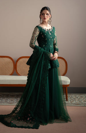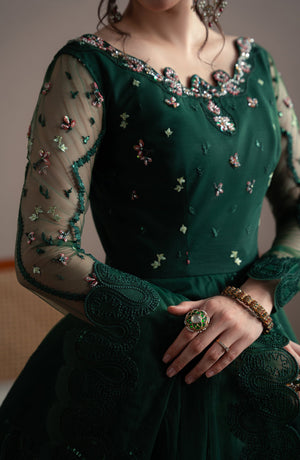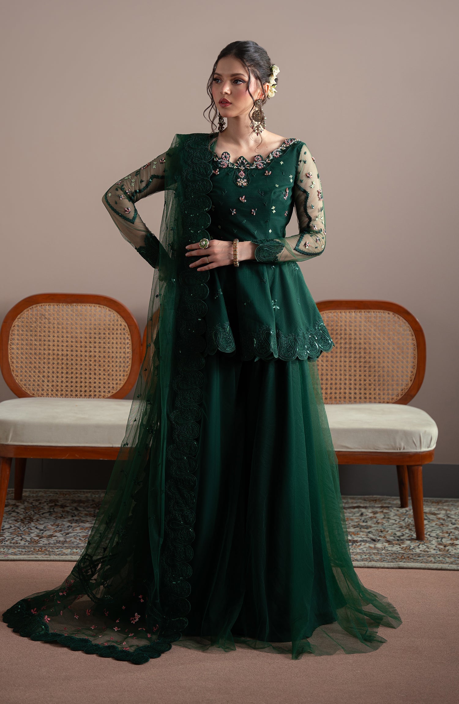 An ode to timeless elegance — the Emerelle Shirt Dress from the Elvin Collection comes in a rich bottle green net, adorned with delicate detailing that radiates grace and charm. Paired with luxuriously soft raw silk trousers draped in an overlay of net, this ensemble strikes the perfect harmony between tradition and modern sophistication. The ethereal net dupatta completes the look, adding a whisper of refinement that makes the Emerelle Shirt Dress an ideal choice for festive soirées and grand celebrations.