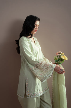 An ode to refined sophistication, the SAGE from the Pret Collection Elvin by Fabiha Fatima radiates understated elegance in pistachio grip silk, defined by its smooth texture and graceful silhouette. Paired with raw silk trousers that add depth and richness, the look is elevated by a sheer organza dupatta that drapes with ethereal finesse. Perfect for festive gatherings and elegant soirées, the SAGE Shirt embodies timeless charm with a modern touch.