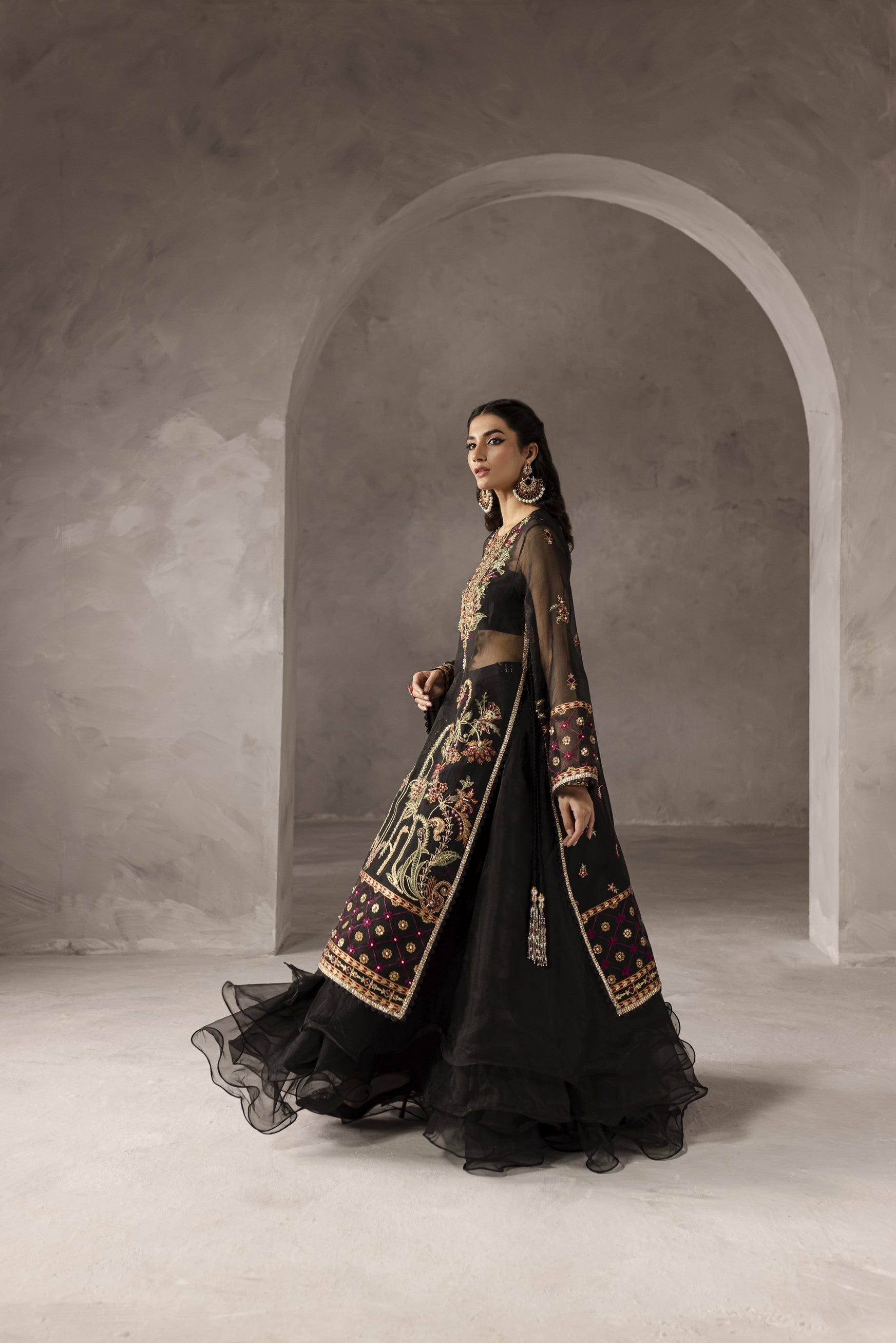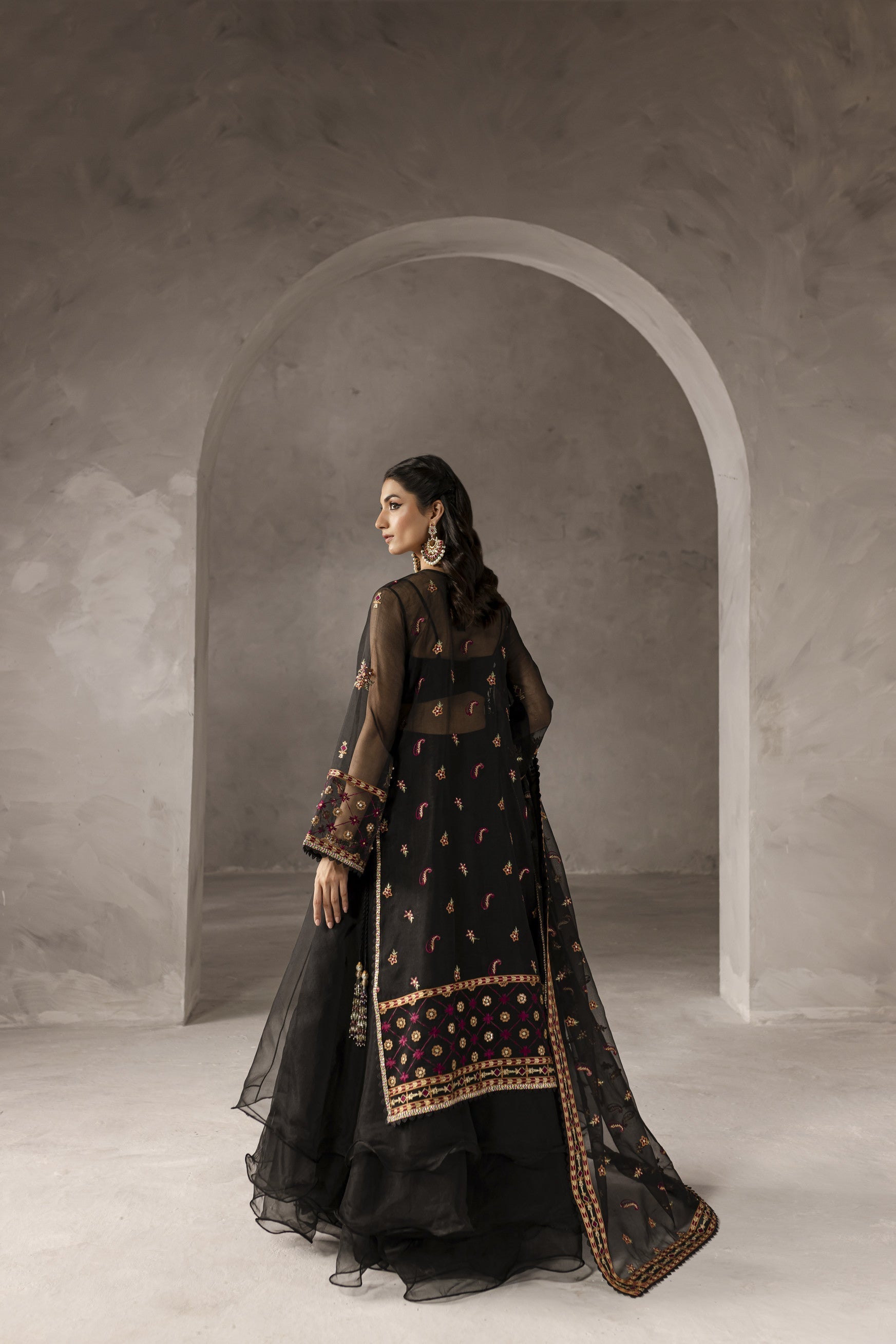 A timeless statement of grace, this black ensemble features a beautifully embroidered organza shirt and dupatta, paired with raw silk trousers. Delicate floral embroidery is enhanced with exquisite handwork, including Kulfi Drops, Kashti Sitara, Crystals, Pearls, Bethki, Japanese Cutt Dana, and Indian Joun Moti. With its intricate craftsmanship and luxurious details, this outfit is perfect for evening soirées, festive gatherings, and formal occasions.