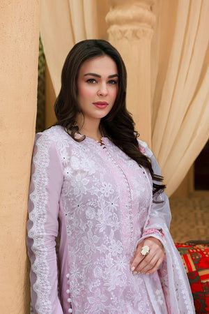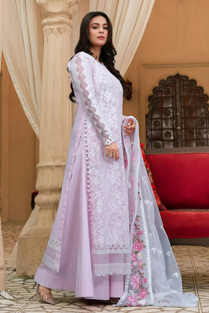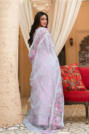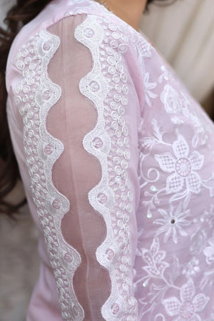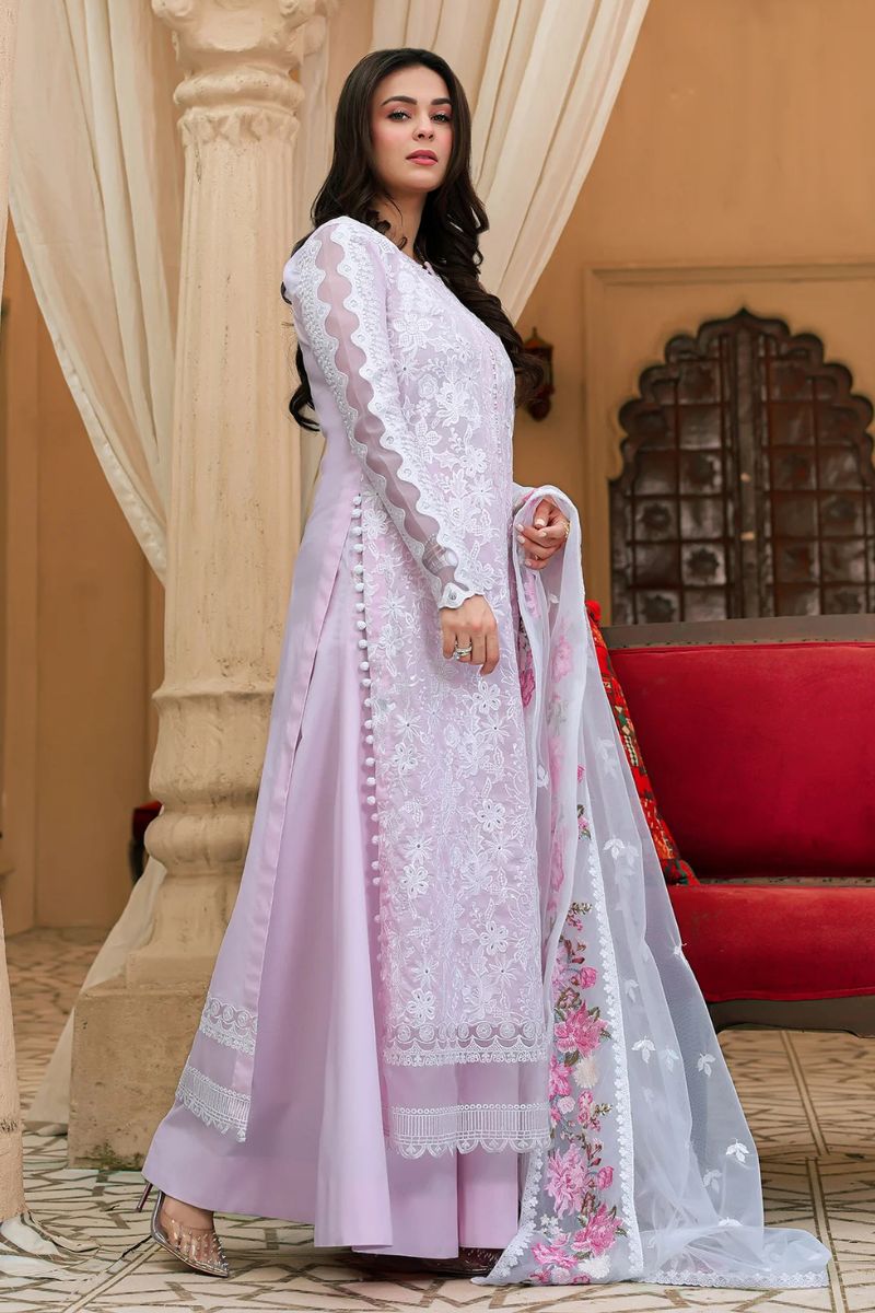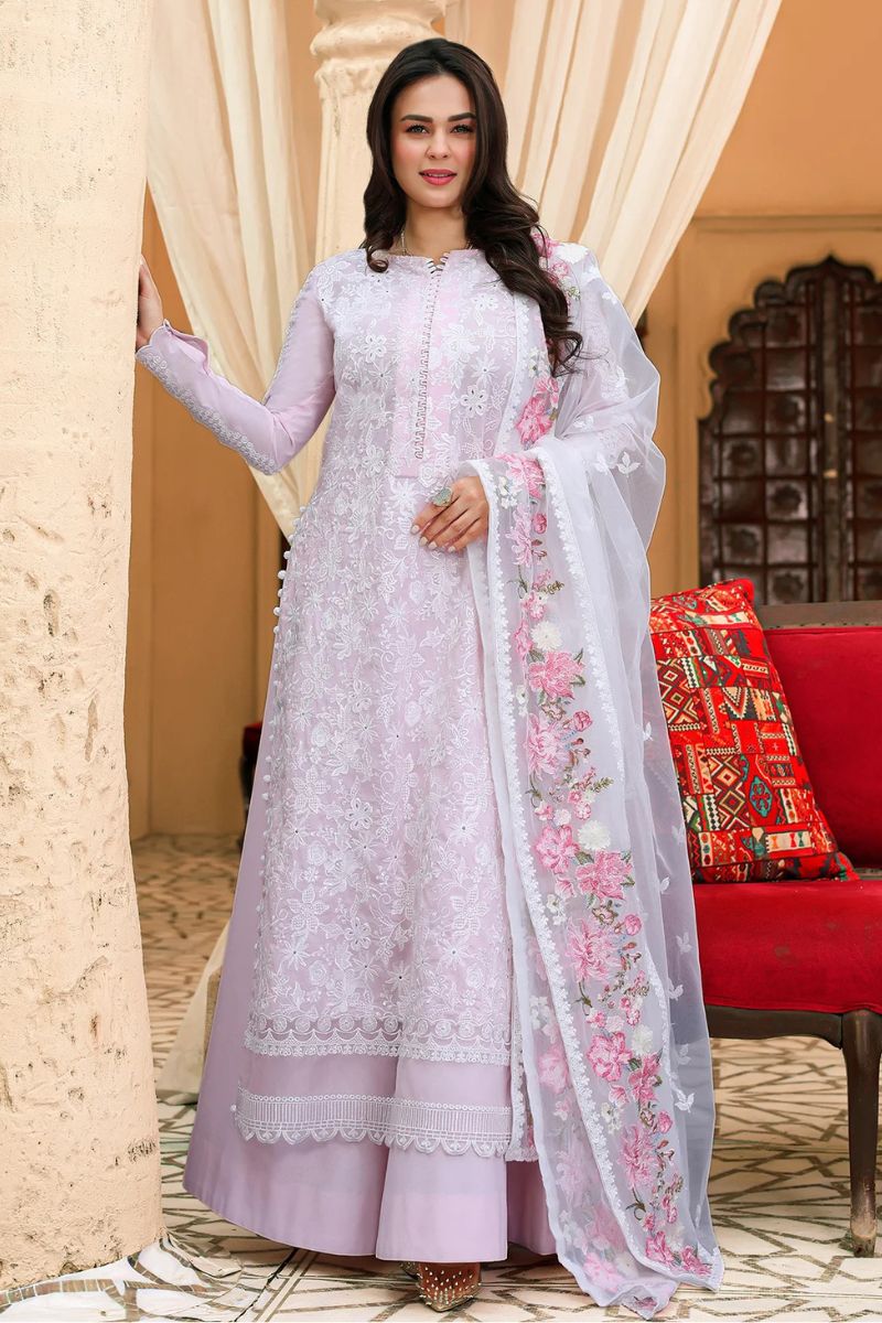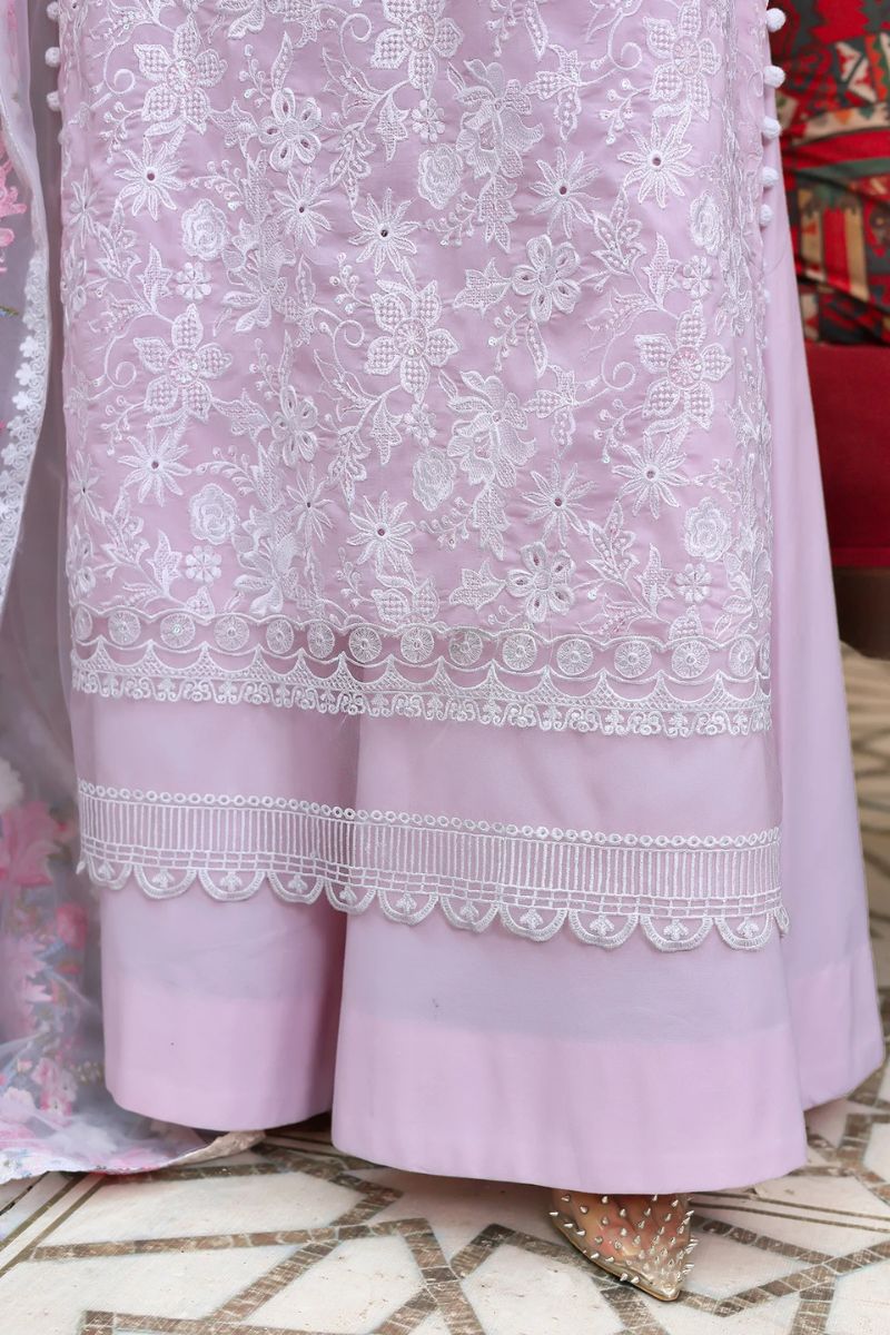 A soft lavender story woven for daylight ease and after-hours charm. Floral embroidery meets sequin glints and chikankari-inspired textures, finished with standout borders and scalloped trimmings a piece that moves with you.