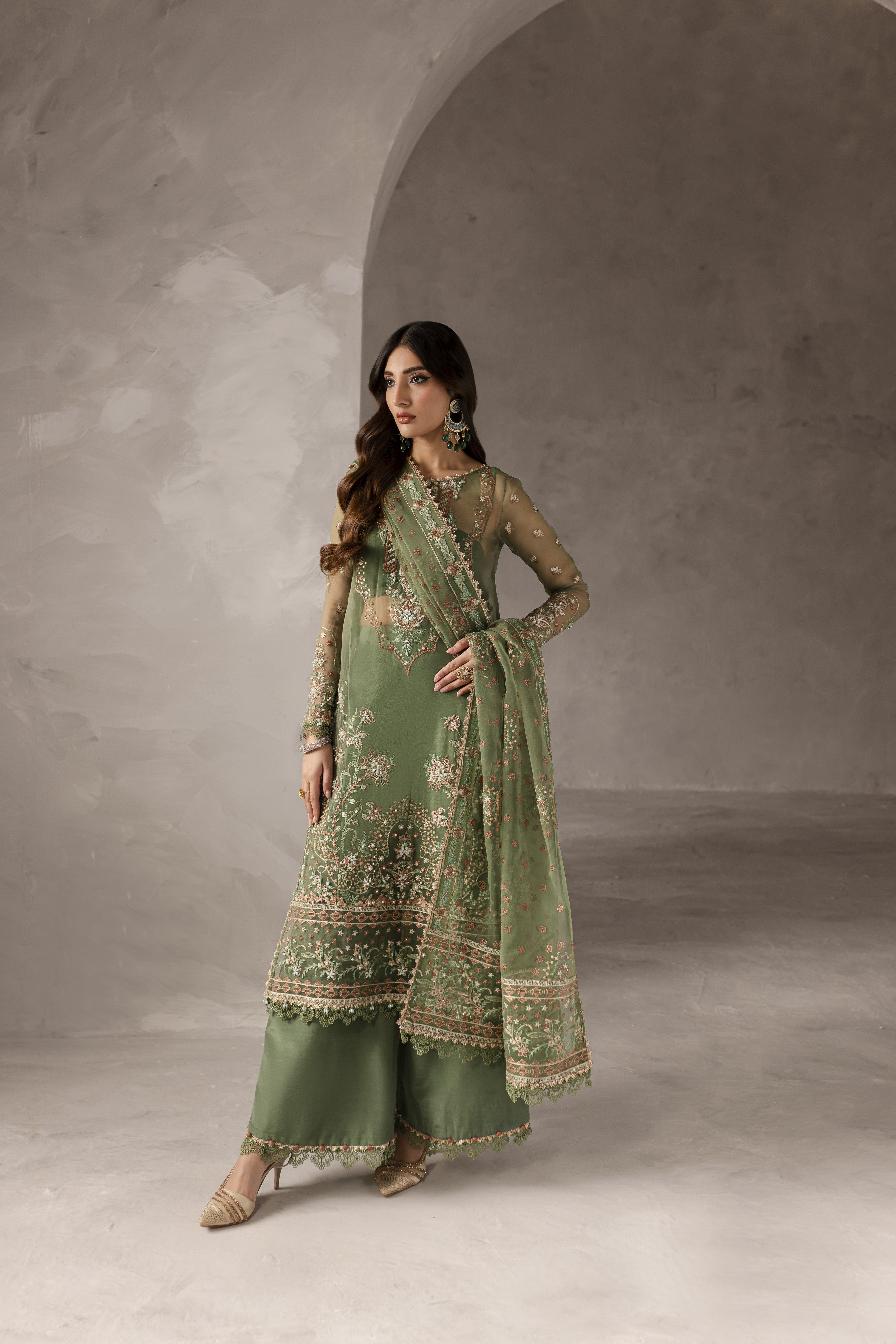 Experience the serene beauty of a blooming paradise with Giardino Fiorito, a luxurious light green dress inspired by the charm of a flowery garden. This exquisite ensemble celebrates femininity with intricate floral designs brought to life through meticulous handwork and embellishments.