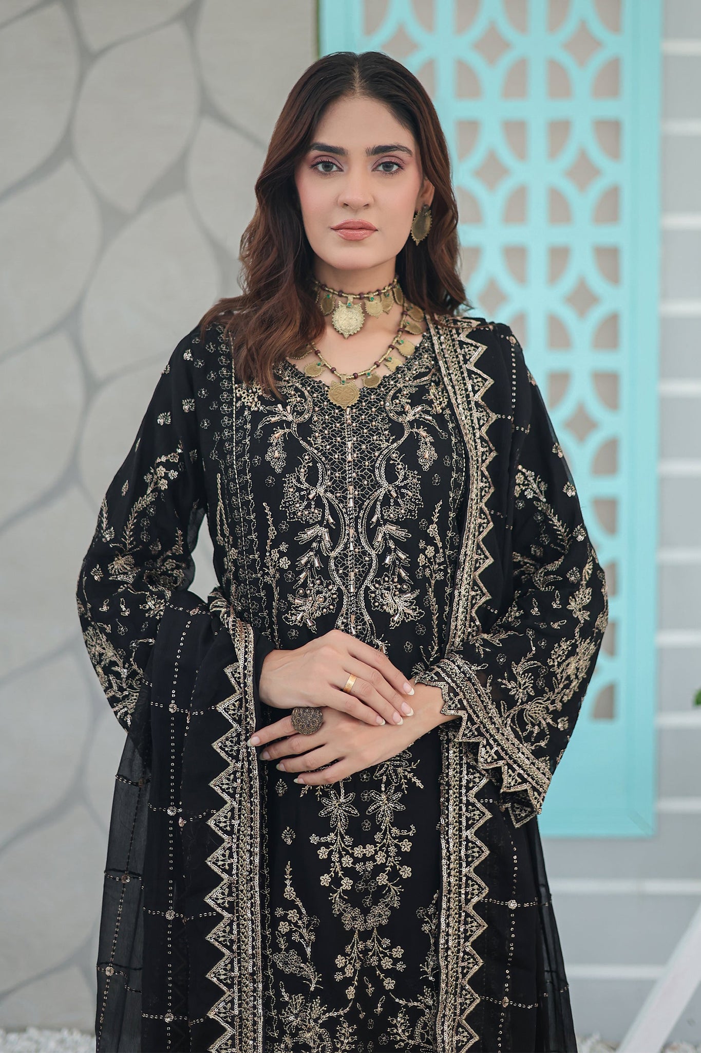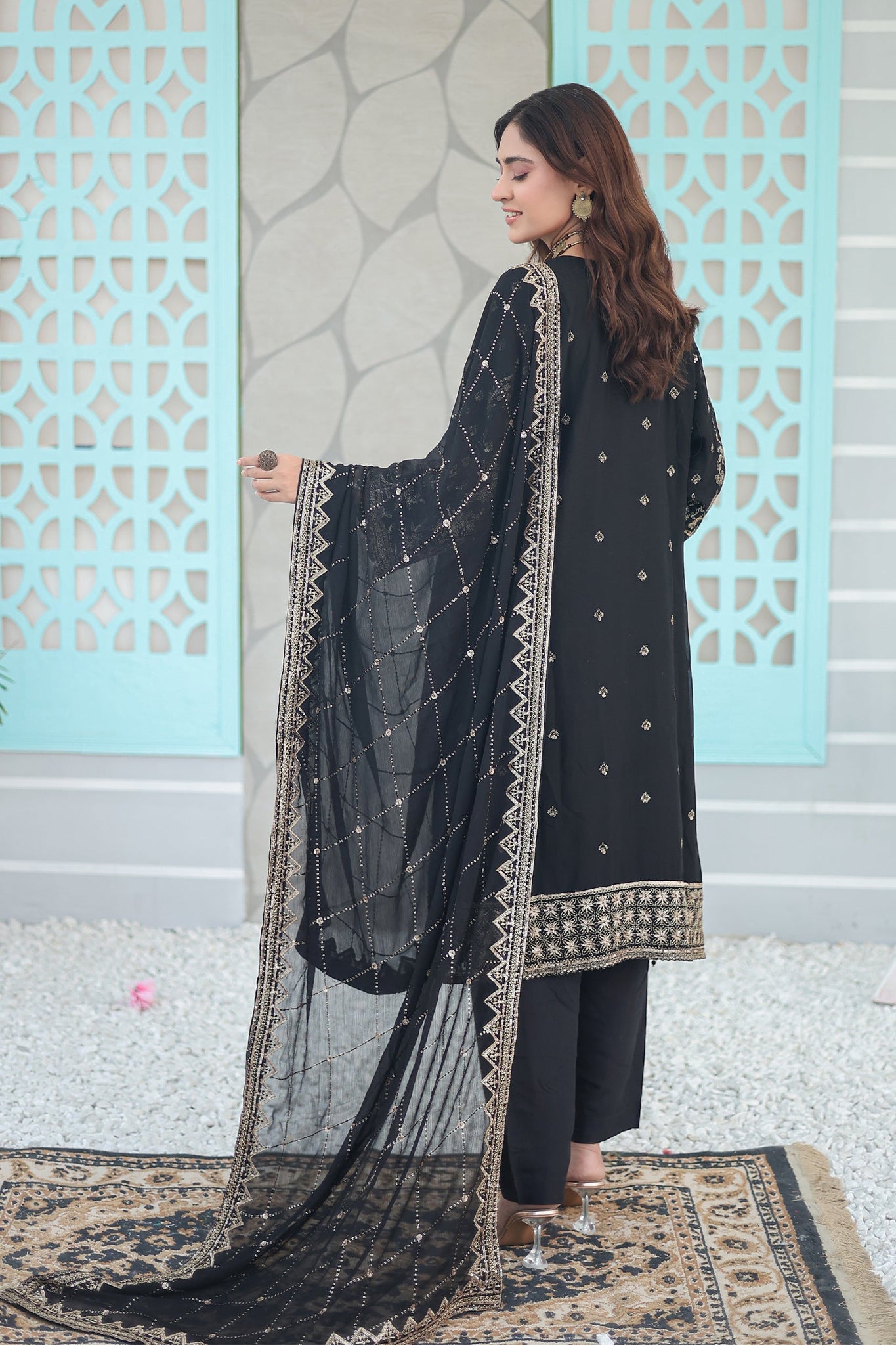 •  Ready to wear four sided sequins embroidered chiffon dupatta
