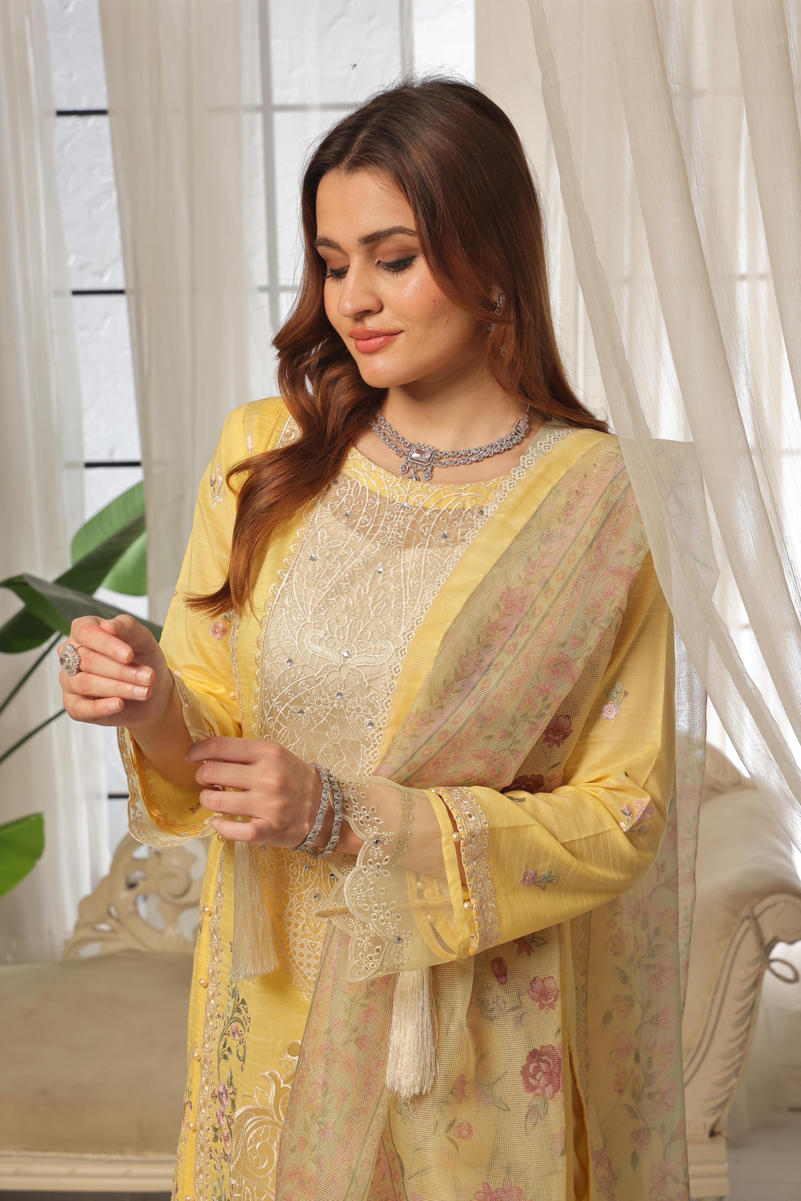 Luxury Embroidered & Printed Dupatta – The stunning embroidered and digitally printed dupatta adds a layer of richness and elegance to your look. The seamless blend of embroidery and prints enhances its charm, making it the perfect statement accessory for Eid.