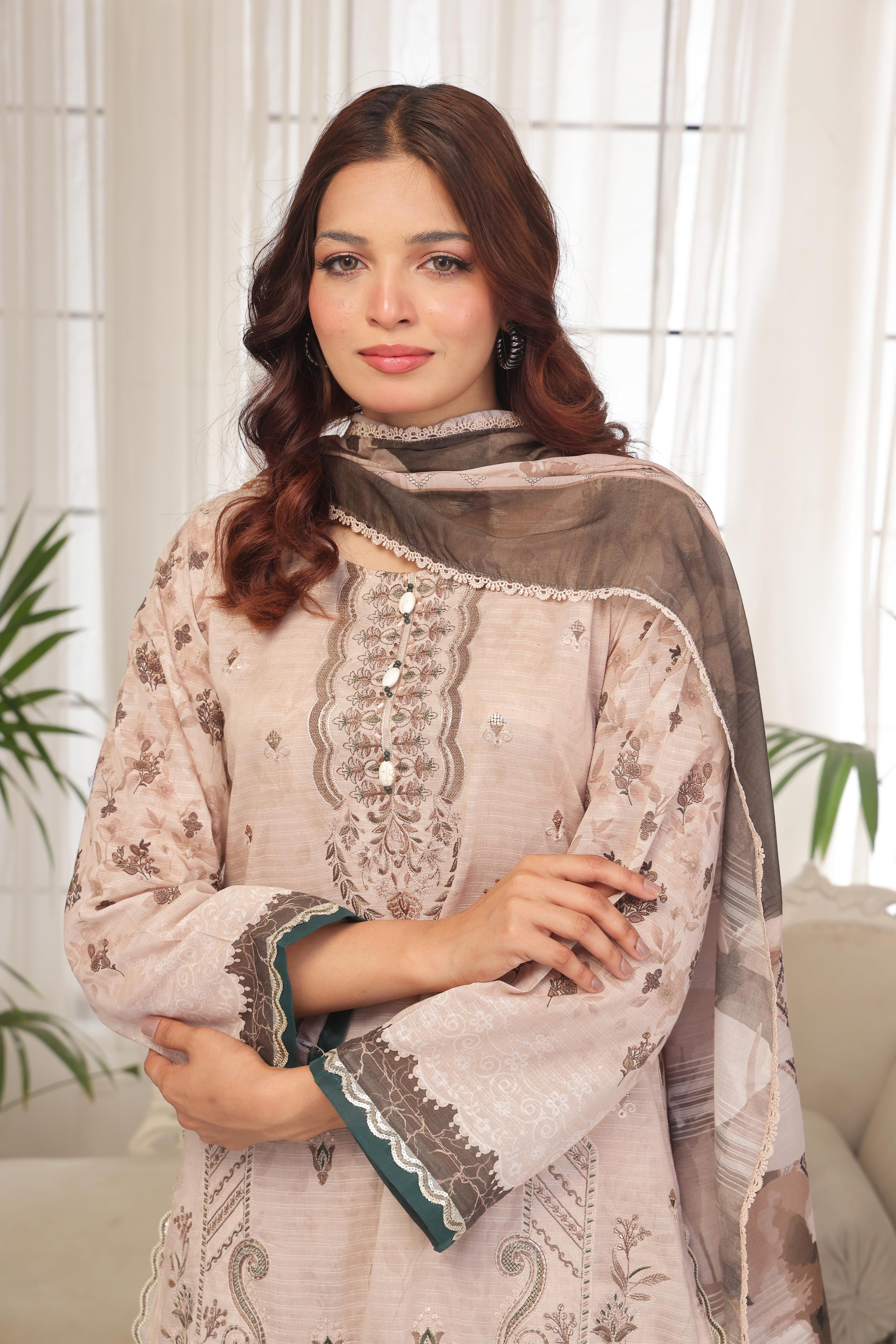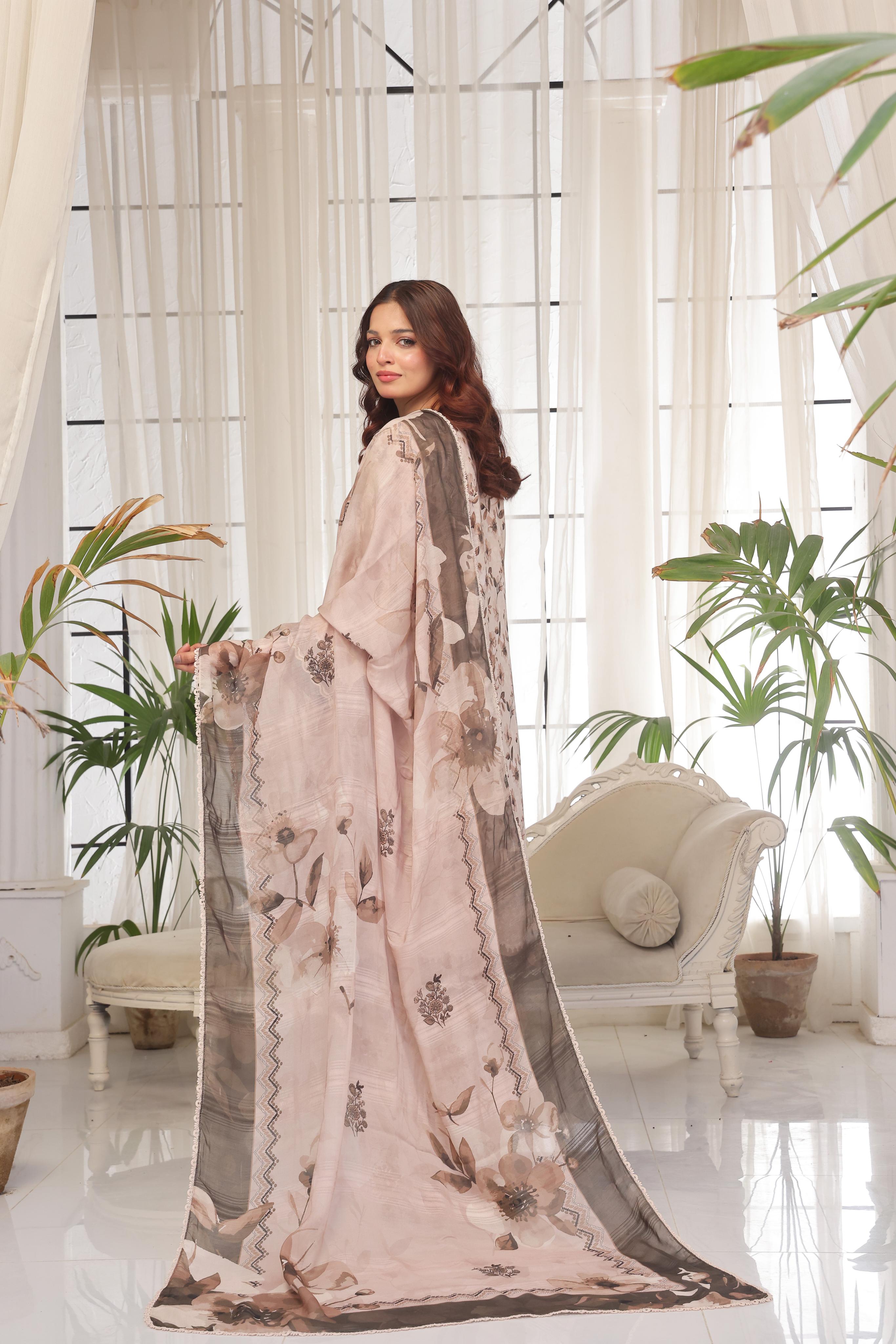 Complementing the shirt, the unstitched trouser features coordinated digital prints and fine embroidery, offering a graceful and complete look.