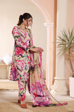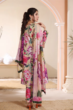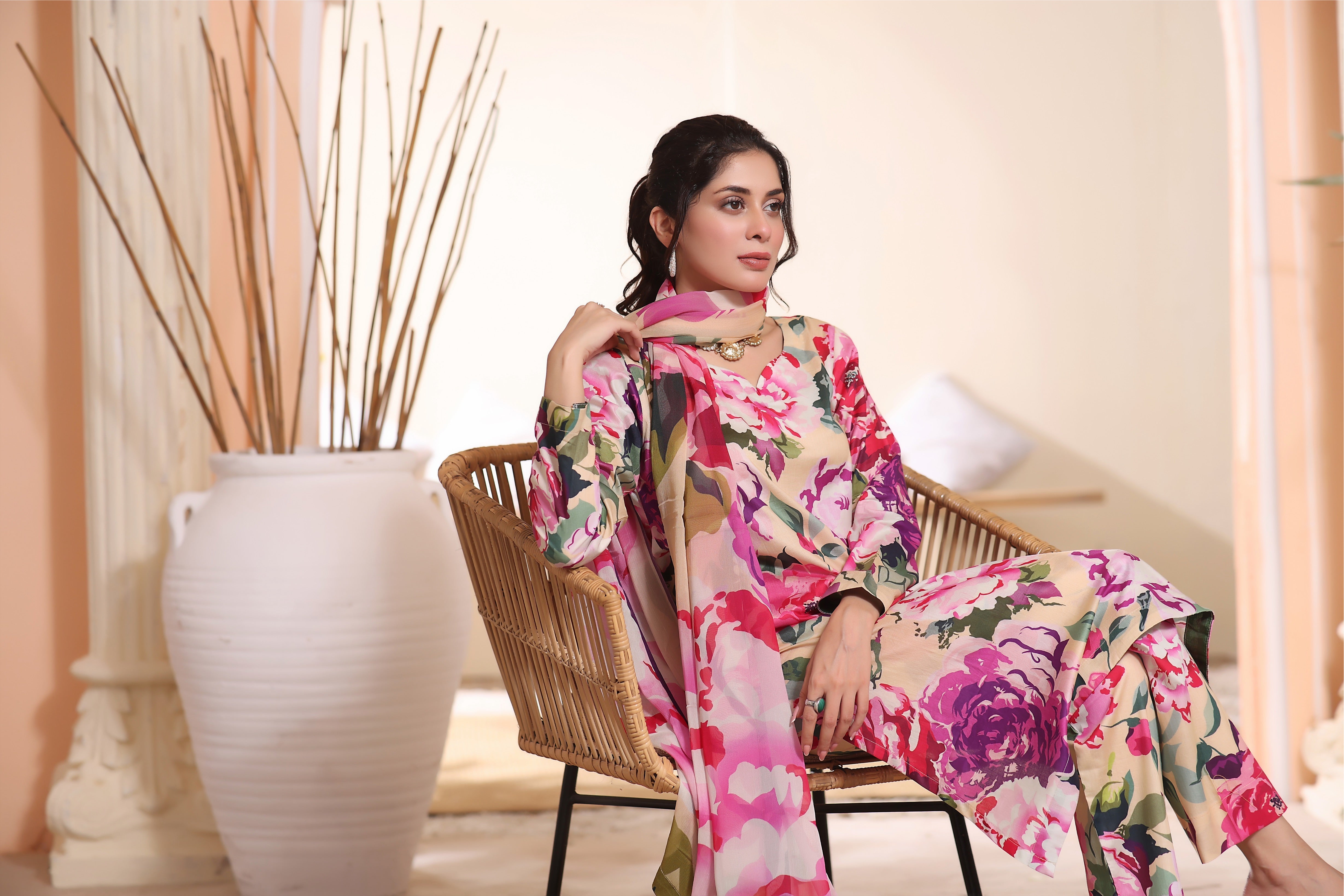 The article includes:Unstitched 3PCDigital Printed Shirt 3 yardsDigital Printed Chiffon Dupatta Digital Printed Trouser 2.5 yards