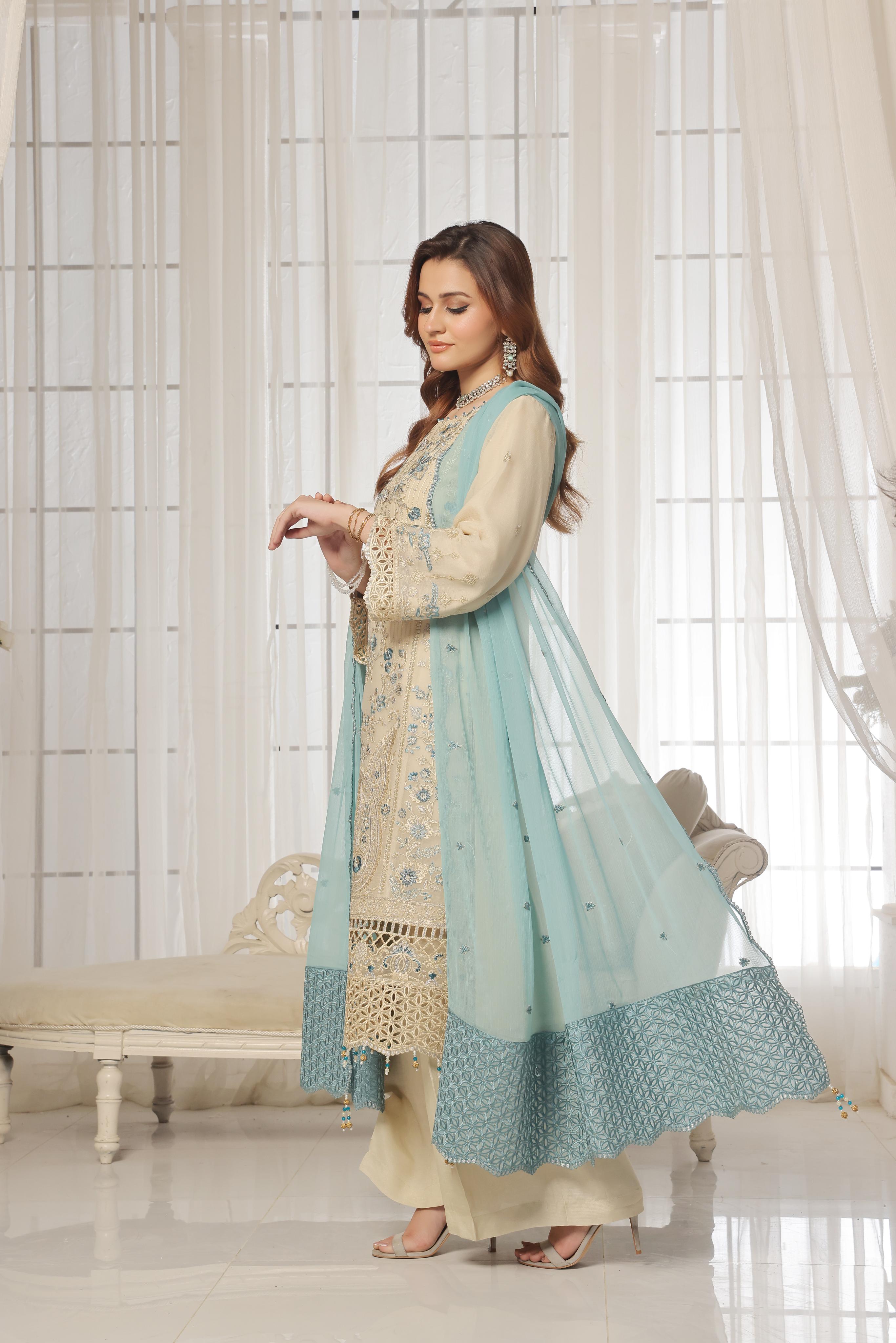 Celebrate Eid 2025 in pure elegance with SELENE, a mesmerizing ensemble crafted to add charm and sophistication to your festive look. Designed with intricate detailing and luxurious fabrics, this outfit is perfect for making a graceful statement.