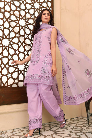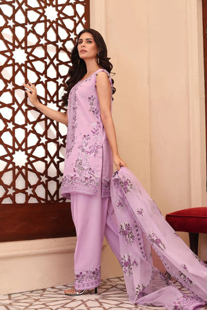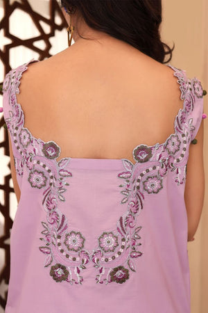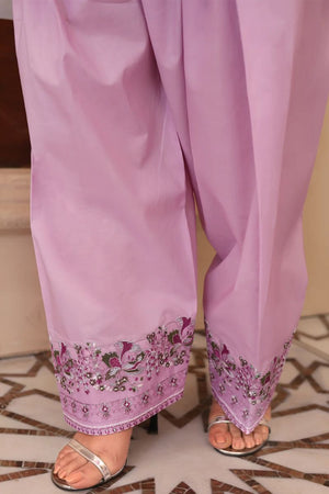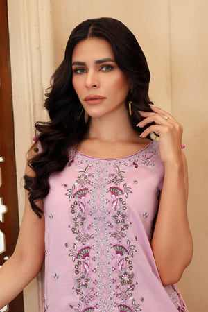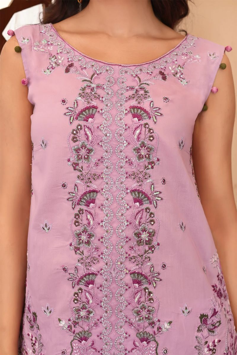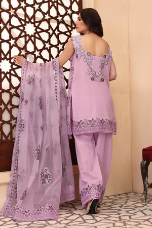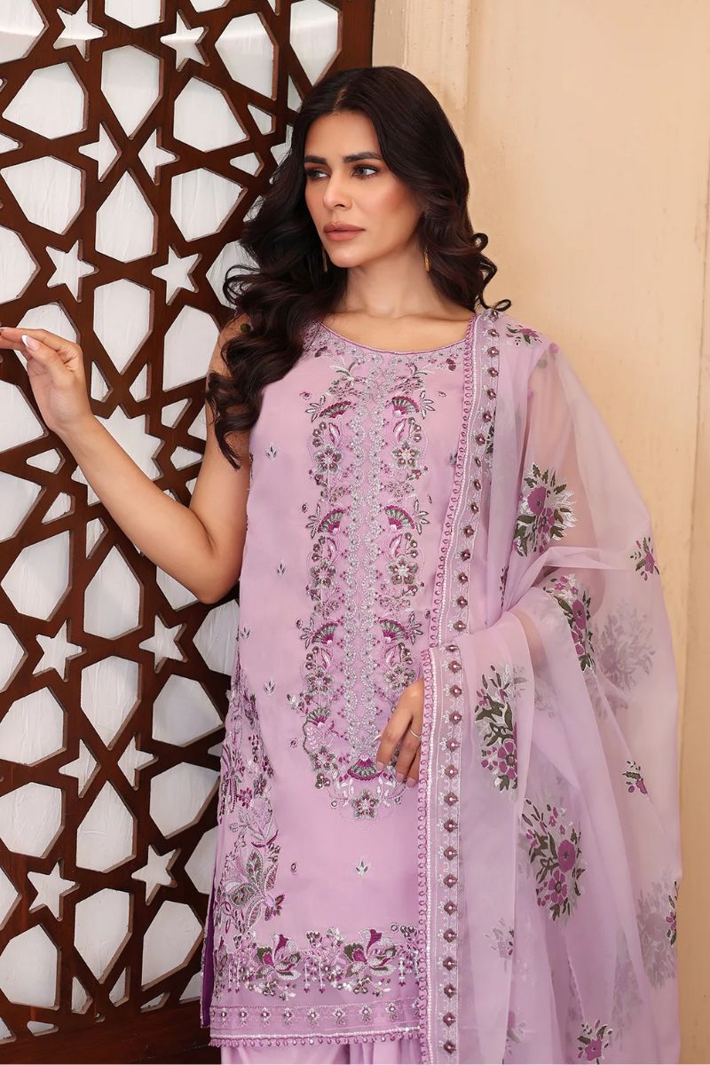 A soft lavender hue adorned with floral embroidery, delicate sequins, and defined borders. The matching dupatta adds movement and texture to this ethereal silhouette.