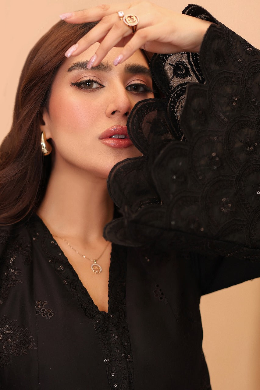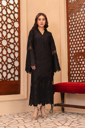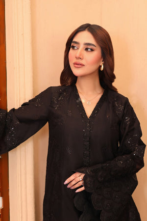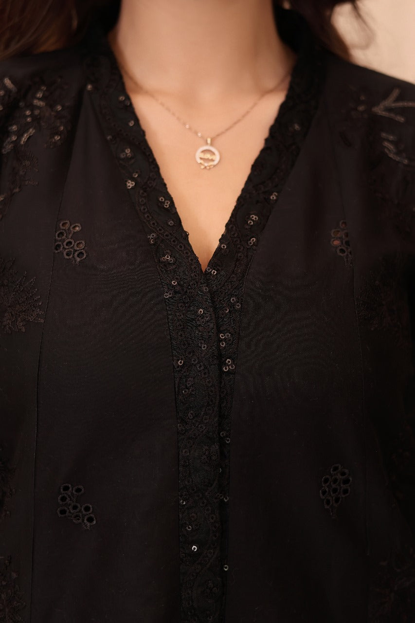 A striking black ensemble crafted in two distinct silhouettes, the flowing Angrakha and the sleek straight shirt, both detailed with bold embroidered borders, delicate sequin accents, and layered threadwork
