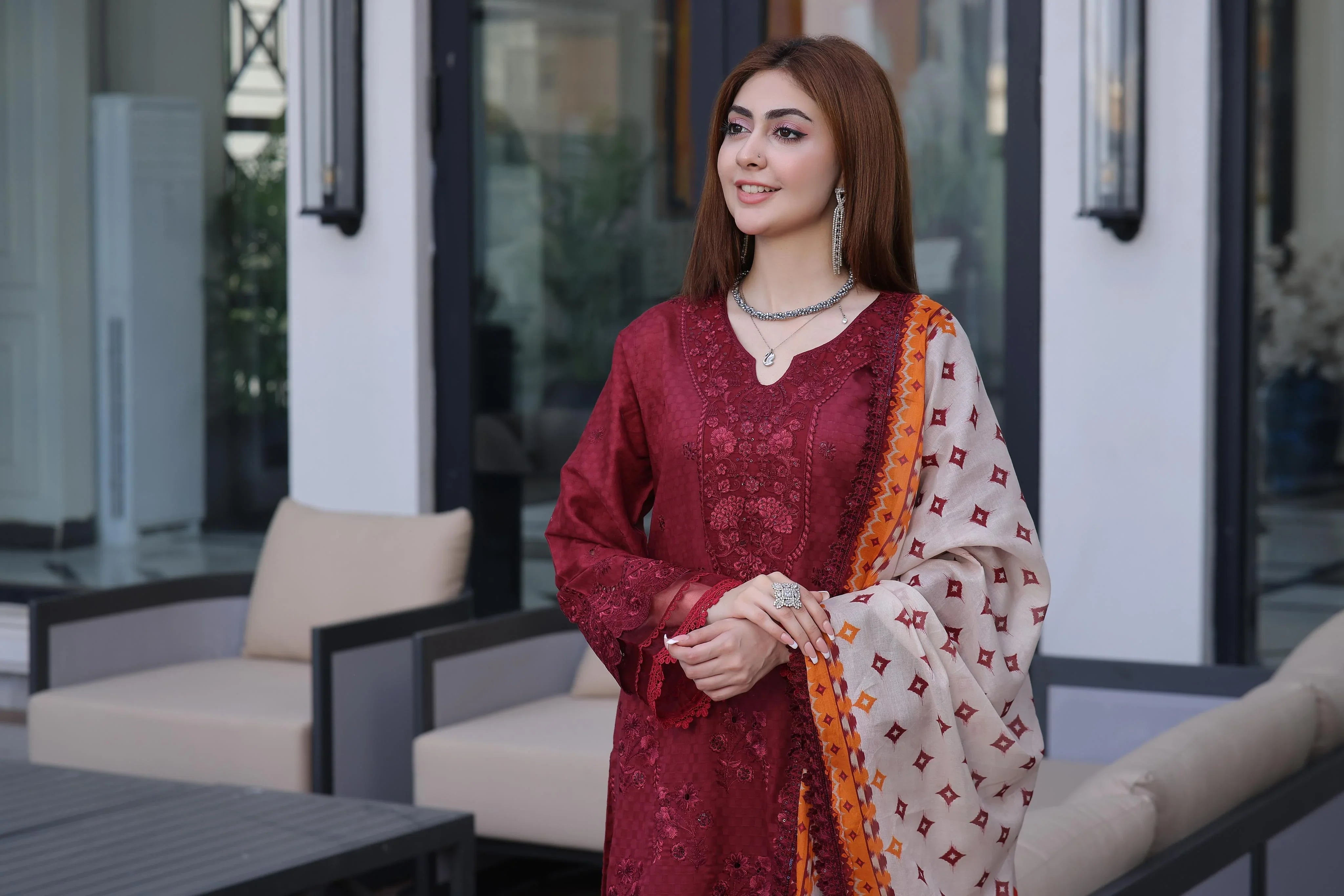 • Dupatta: A beautifully designed fancy printed lawn dupatta with delicate embroidery, adding a touch of sophistication.