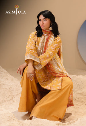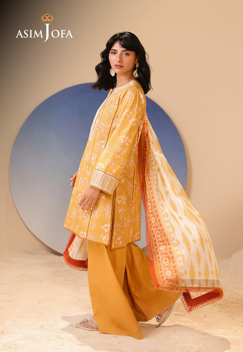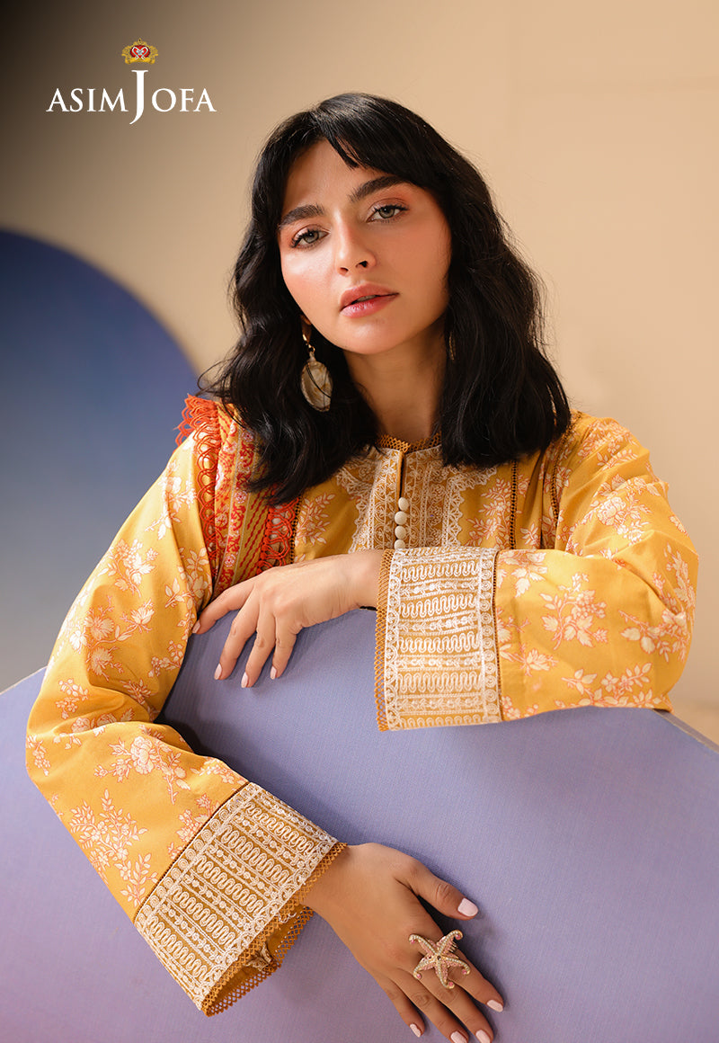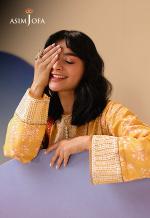 As gentle as sunlight filtering through lace curtains, this yellow ensemble glows with muted prints. Embroidery along the neckline and sleeves adds a soft texture, while the printed airy dupatta flutters like a summer breeze through golden fields.