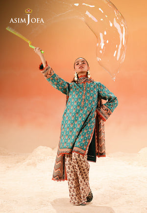 Art and attire blend in this teal ensemble where the shirt and trousers showcase contrasting prints that spark intrigue. A chevron-designed printed dupatta adds movement like ripples on a sunlit lake, completing a look that feels effortlessly expressive.