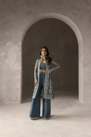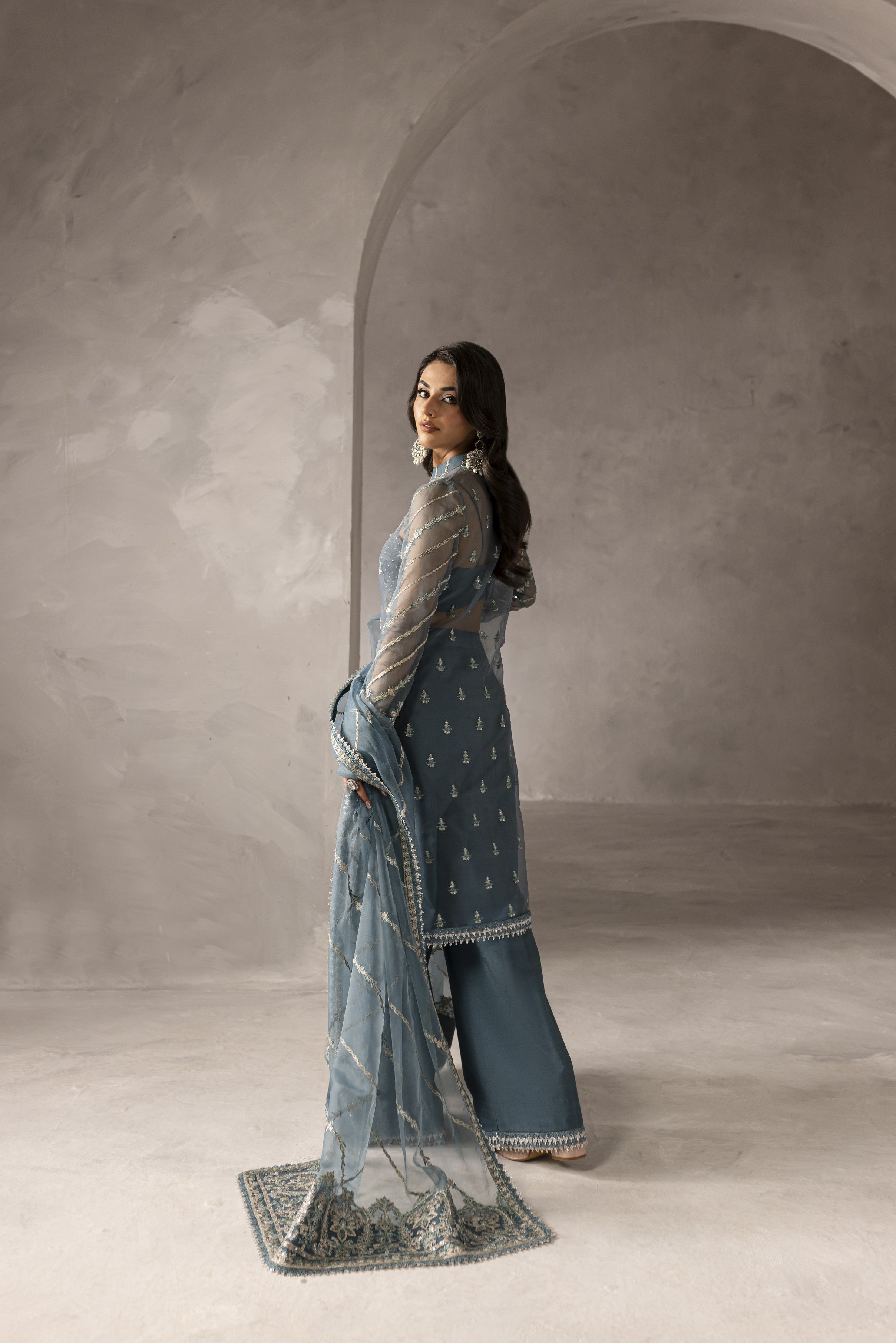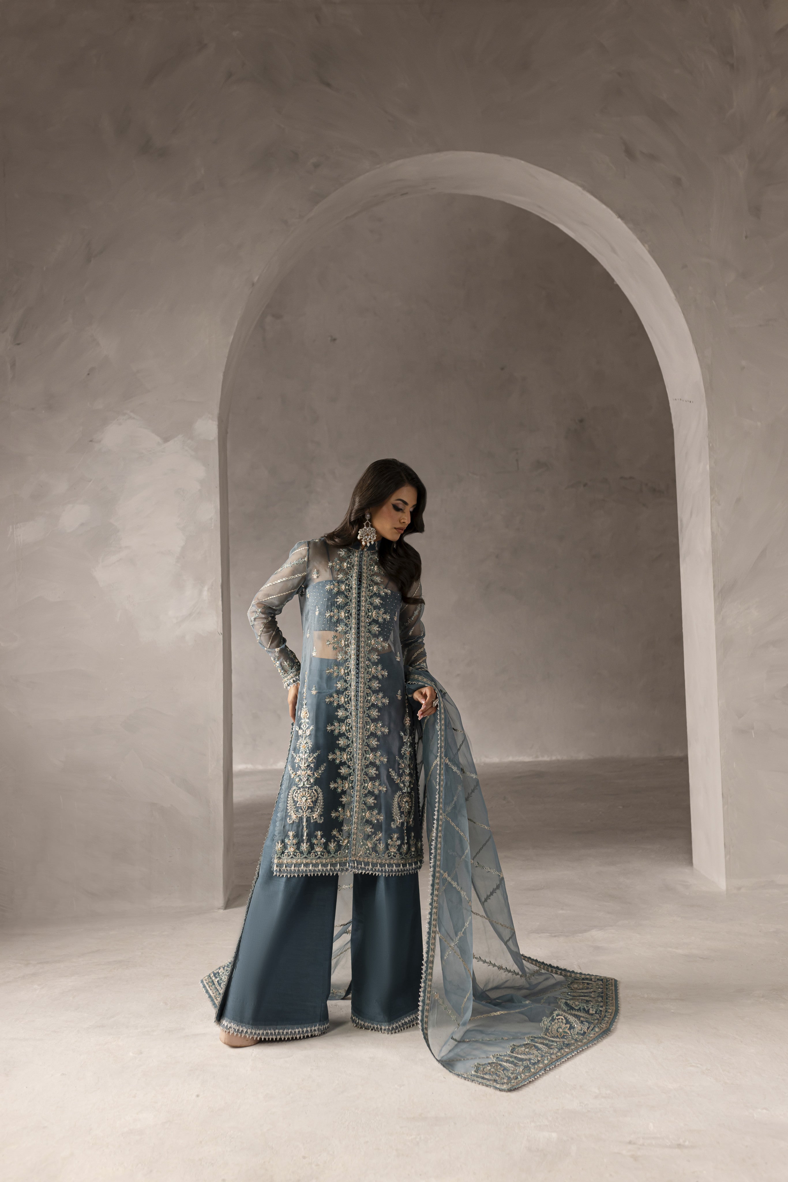 Step into the tranquility of morning with Rosée du Matin, a luxurious ice-blue dress inspired by the ethereal beauty of morning dew. This masterpiece captures the serene charm of early light, crafted with intricate hand embroidery and embellishments that exude timeless grace.