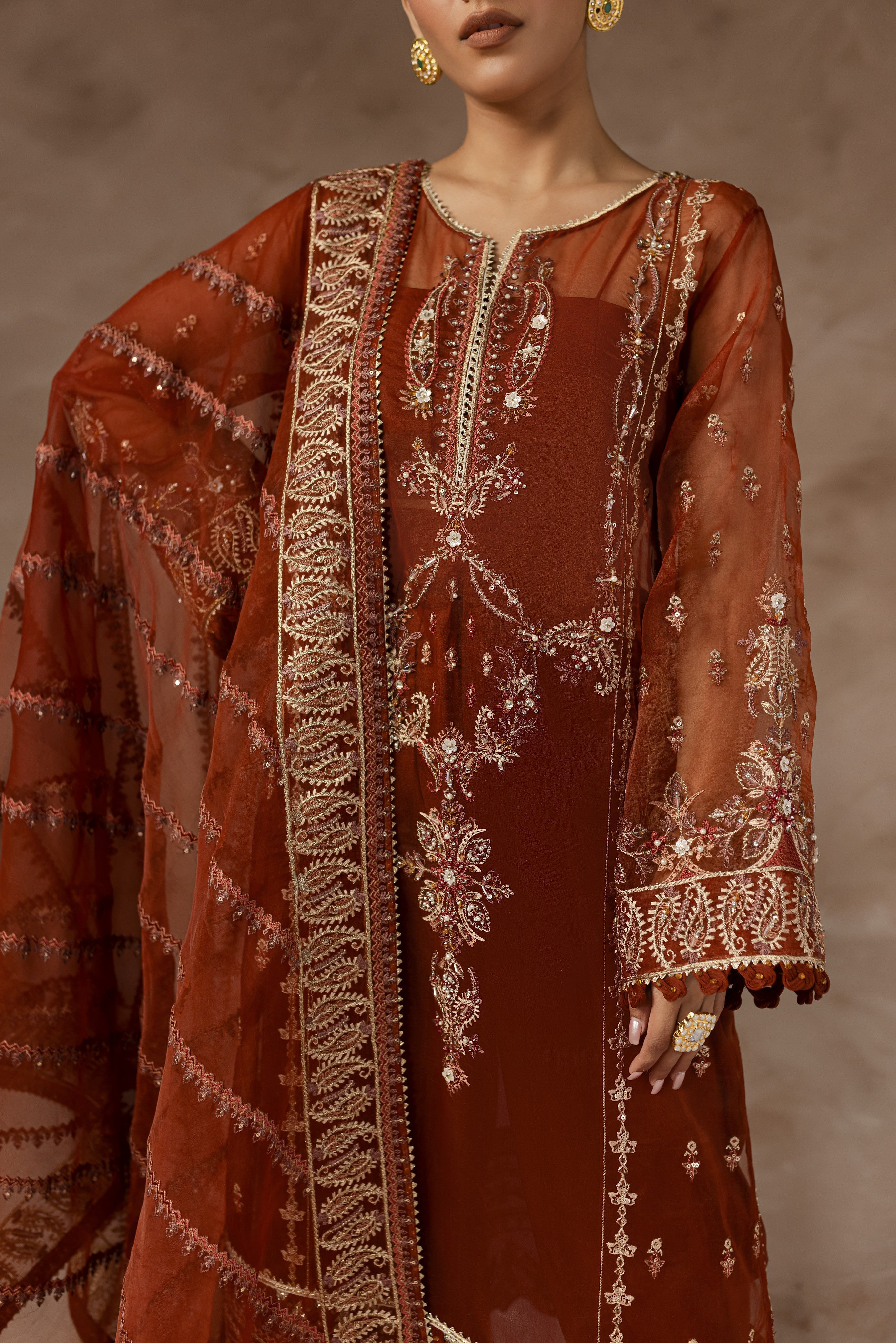 Radiating refined luxury, this rust-red ensemble features an ethereal organza shirt and dupatta, paired with elegantly tailored raw silk trousers. Intricately hand-embellished with Kulfi Drops, Pipe Work, Crystals, Pearls, Bethki, Japanese Cutt Dana, Telenor Sitara, and Cup Sitara, it exudes a mesmerizing shimmer and sophistication. A perfect choice for weddings and festive occasions, where tradition meets classic glamour.