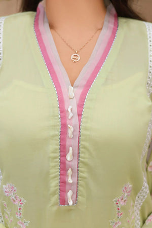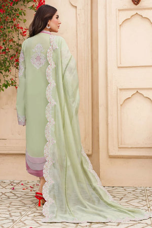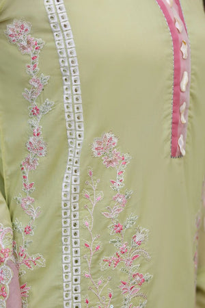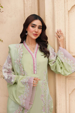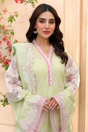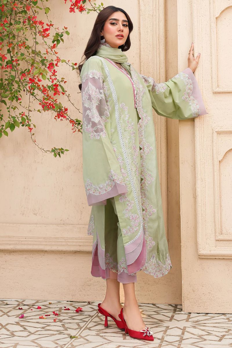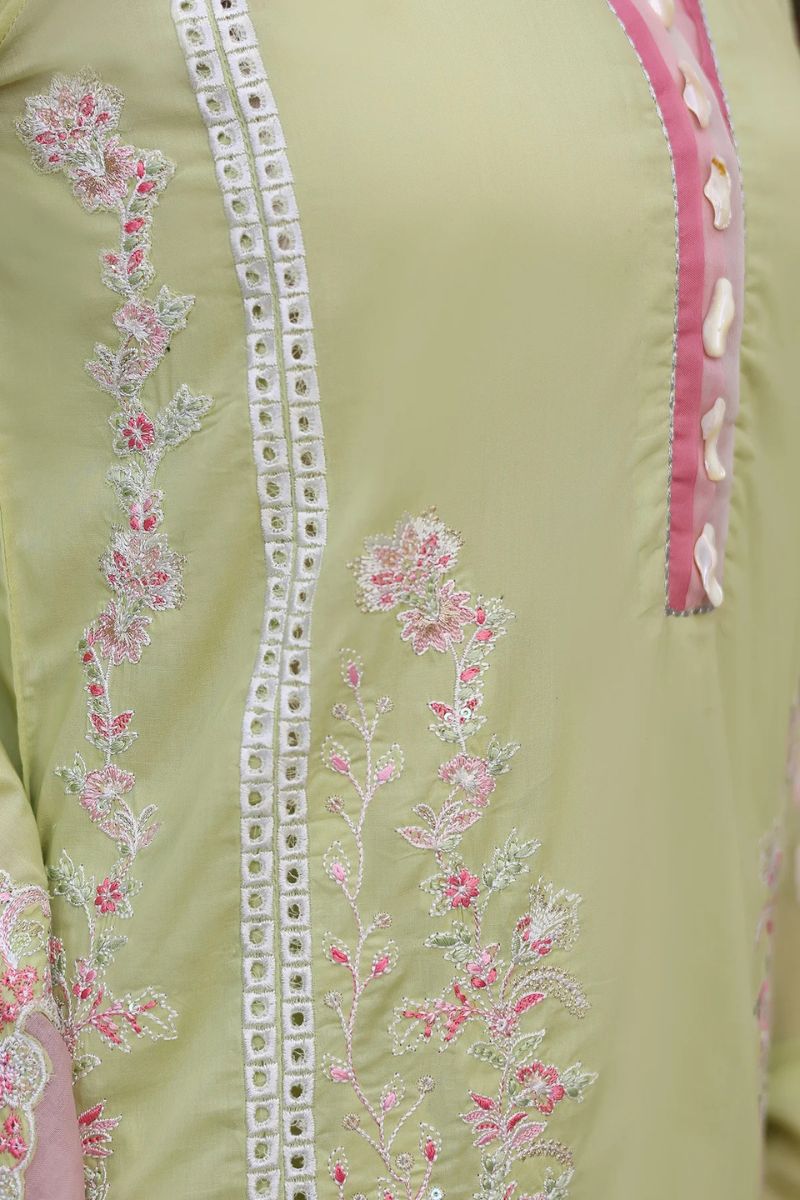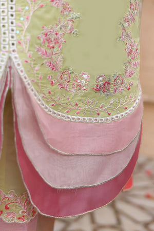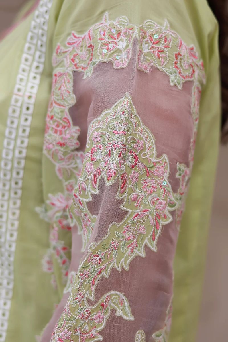 A pistachio dream woven in soft floral vines, touched with pink and ivory threads, tilla, and schiffli textures. The sheer dupatta blooms with vivid florals and bold borders ? a quiet celebration of spring.