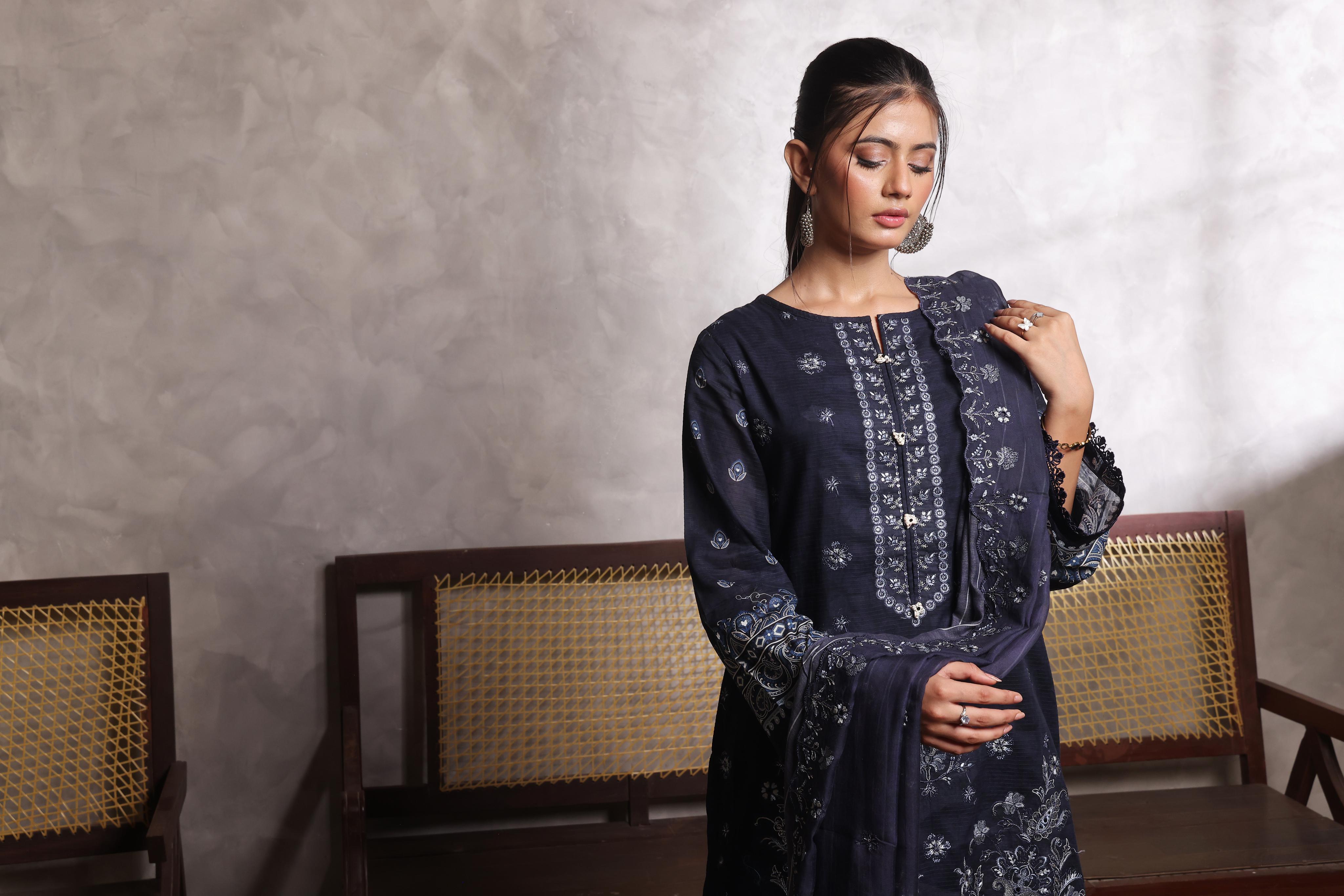 Immerse yourself in grace with the unstitched Heavy Chiken-Kari Embroidered Bana Dora Digital Printed Lawn shirt. A striking blend of traditional artistry and modern flair, perfect for elevating your seasonal wardrobe.